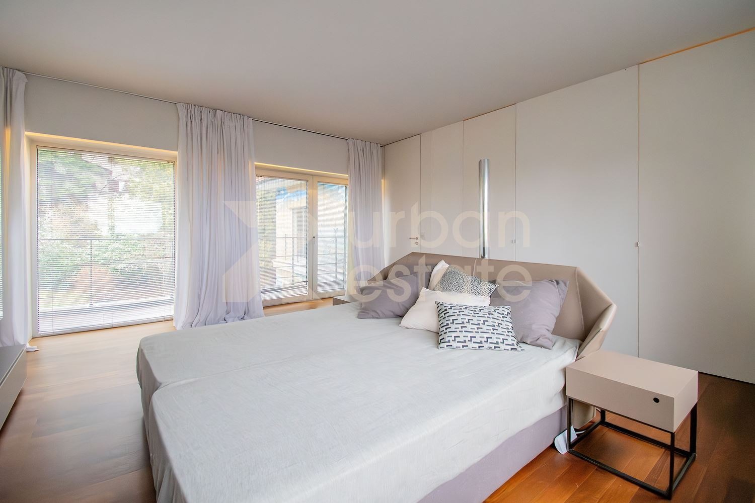 -впечатляваща родителска спалня със собствена баня, два дрешника и голяма панорамна тераса