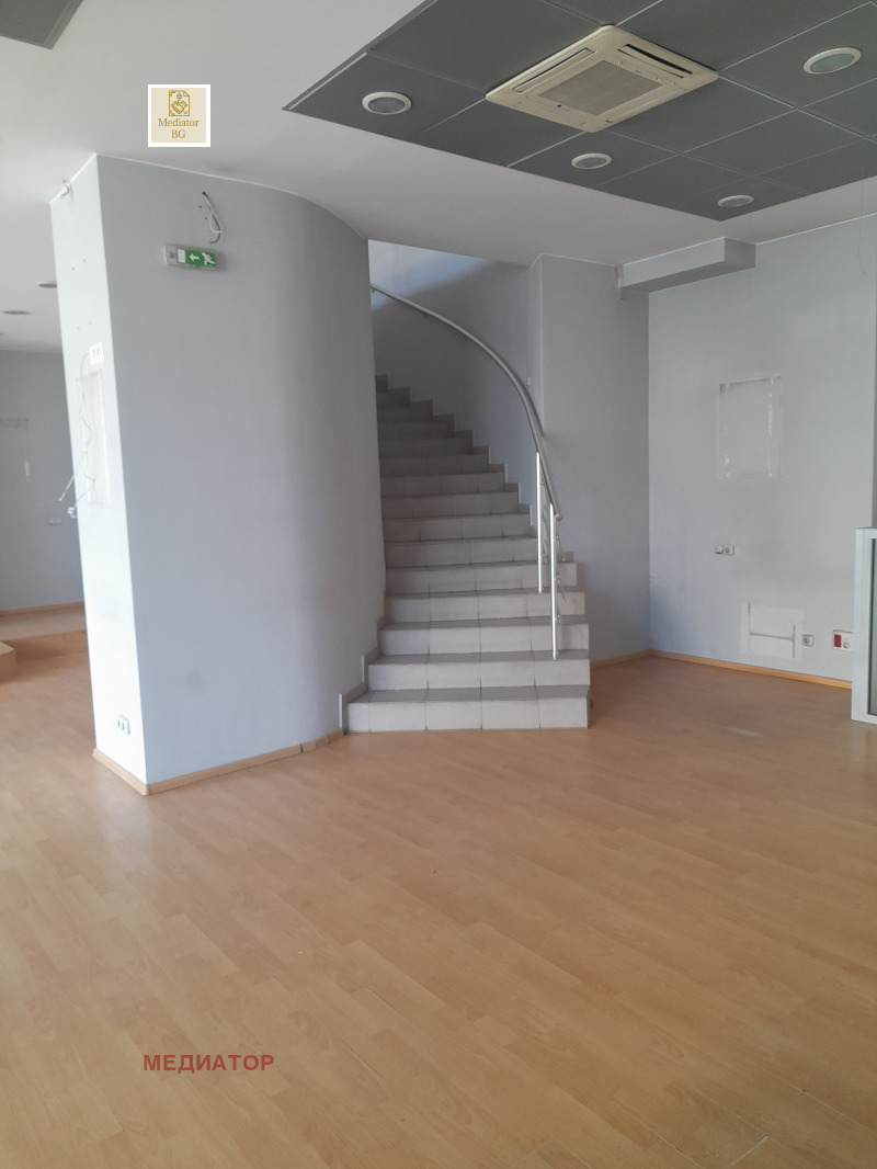 Офис на три нива, като основните - партер и 1-ви етаж са с еднаква квадратура от около 130 кв.м. Ниво -1 е с по-малка квадратура и представлява склад, сървърно помещение и помещение с висока защита. На всяко ниво има санитарен възел, а второто ниво е разделено с временна преграда на кабинети основно помещение. Ползвало се е за банков офис. Настилките са ламинат, стените латекс, с високи тавани. Търсете Александър - 0888 80 00 34