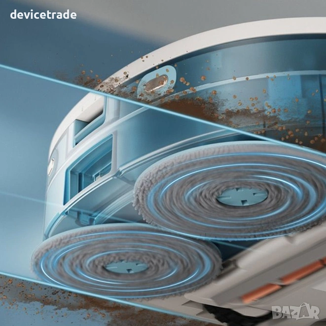 Роботът почиства и мие твърдите подове с едно движение, като ефективно се справя с финия слой прах, който се натрупва ежедневно, както и с по-предизвикателни замърсявания като отпечатъци от кални лапи и петна. Двойните мопове на робота са проектирани да бъдат нежни към повърхностите, но и да премахват замърсяванията. Роботът разполага с капацитет на резервоара за вода, който е оборудван да се справи с всичките ви нужди от почистване с едно движение, спестявайки ви време и усилия. Насладете се на безупречно чисти подове дори когато сте боси.