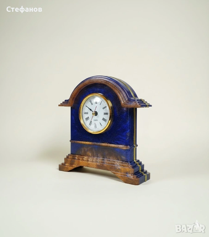 Ръчно изработен от епоксидна смола в кралско синьо с мраморен ефект и топли златисти нюанси, които привличат погледа и създават луксозна визия. Кварцов механизъм, римски цифри и прецизна изработка, която привлича погледа. Подходящ размер за нощно шкафче, бюро или масичка - 15,5х16х5 см.