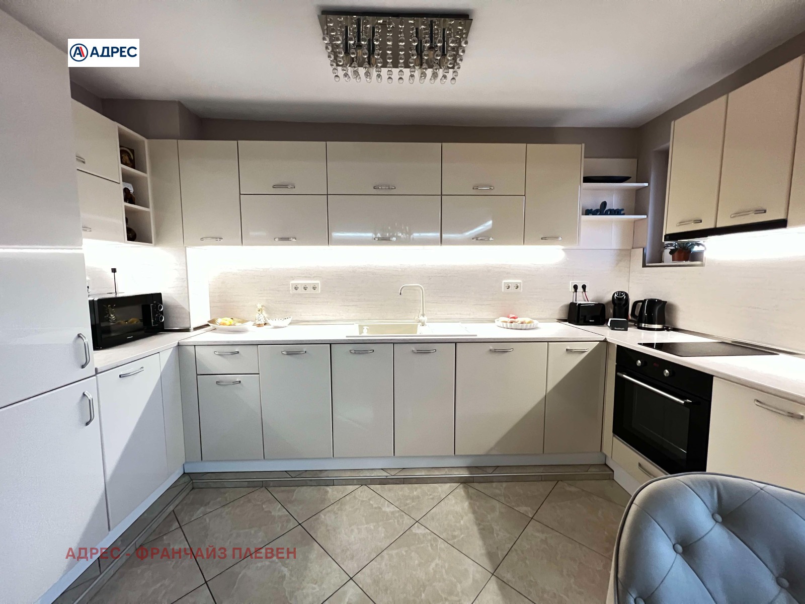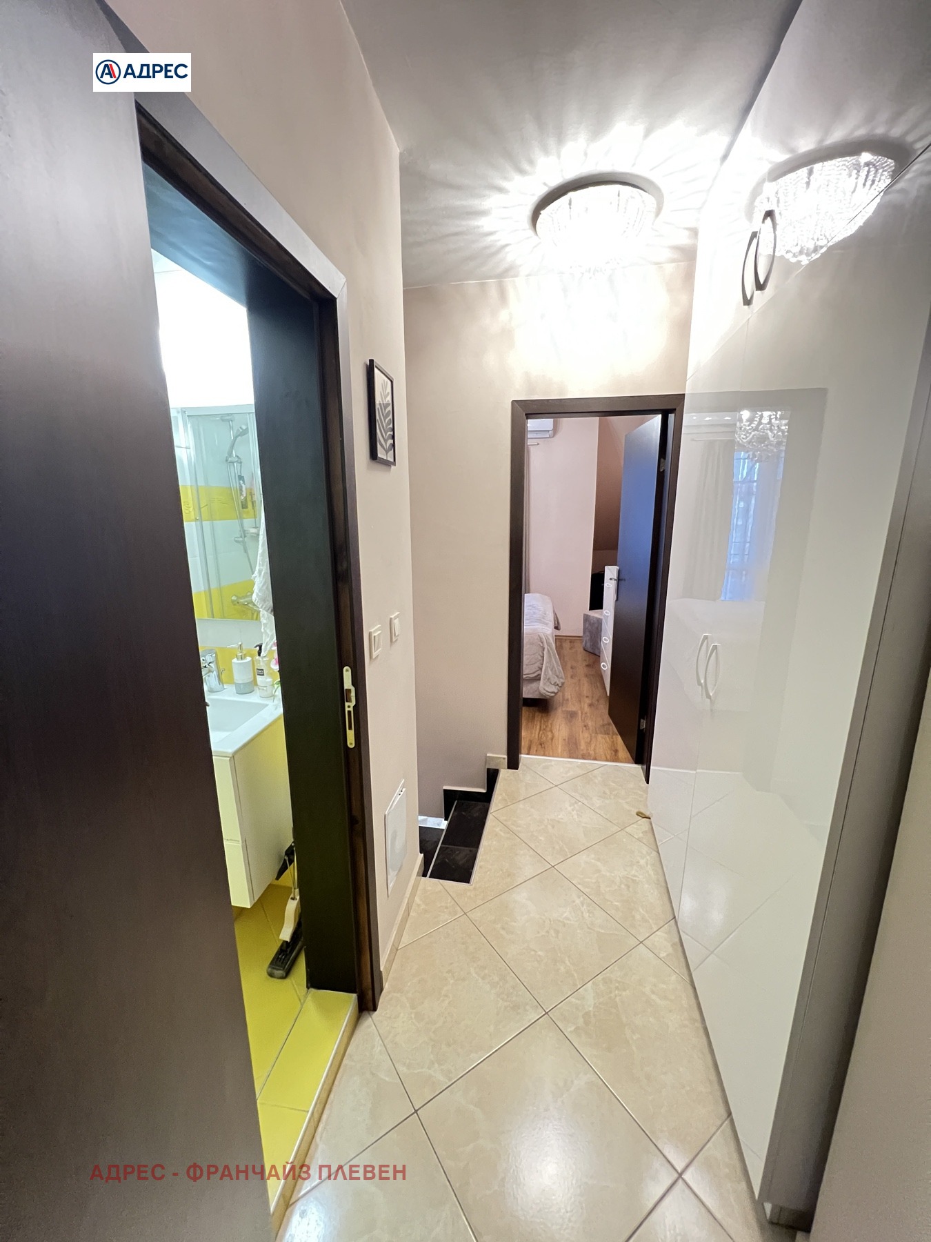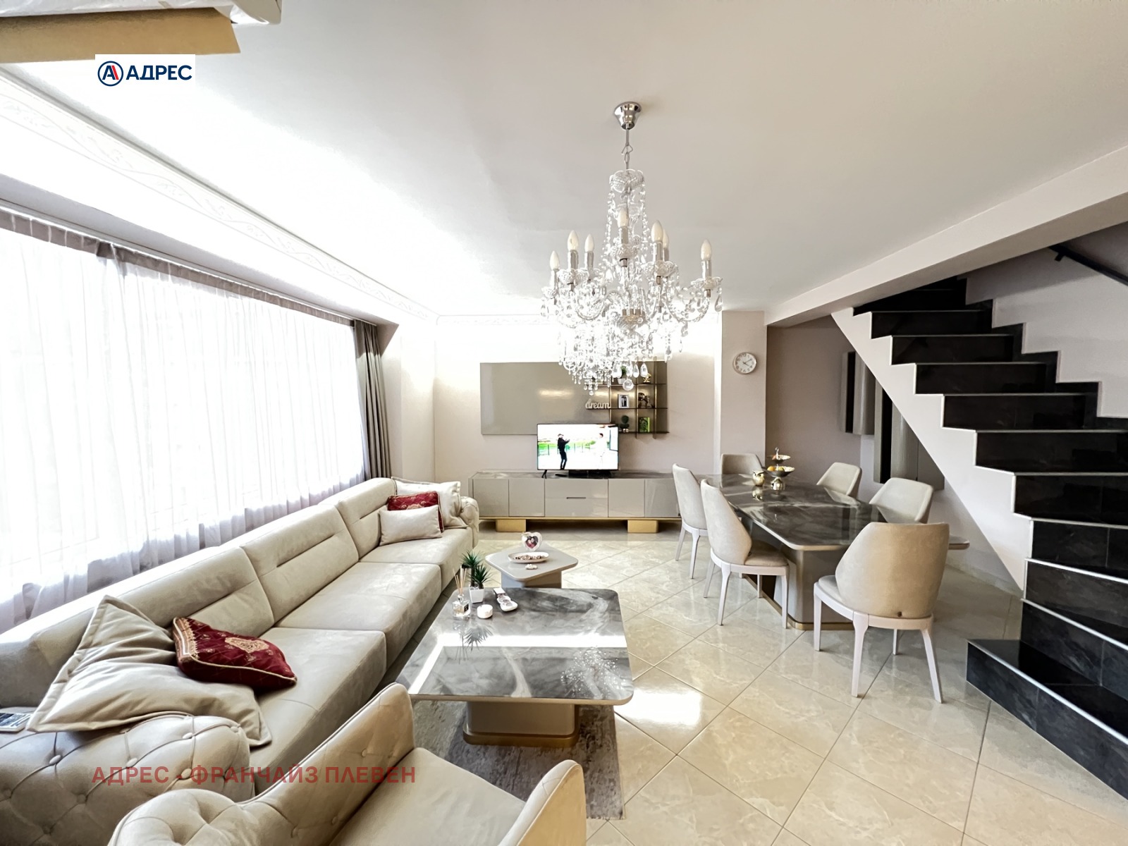 Агенция за недвижими имоти ''Адрес'' предлага мезонет в центъра на град Плевен. Жилището се намира в нова кооперация и е напълно обзаведено, с нови луксозни мебели и всички необходими електроуреди. Разпределение: ниво 1: входно антре, изключително просторна дневна с кухня и трапезария, тоалетна; ниво 2 : две спални, баня с тоалетна, две тераси. Настилки- ламинат, гранитогрес. Отопление- климатици.