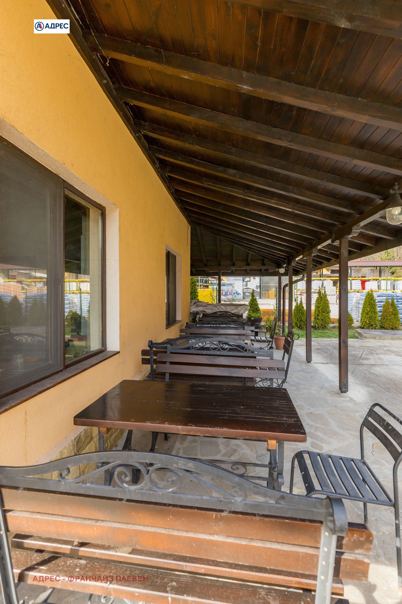 Имотът разполага с голям двор от 1325 кв.м., с налично работещо външно заведение/ресторант. Външното заведение в момента е отдадено под наем и носи целогодишен доход.