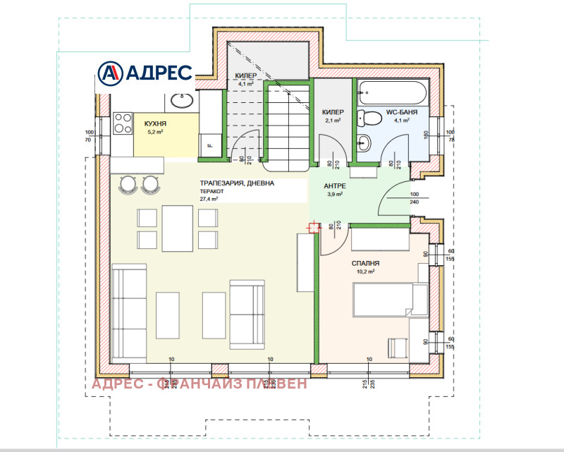 Имотът е проектиран с внимание към функционалността и светлината, като предлага следното разпределение: