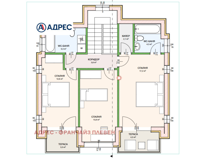 Втори етаж: Тук са разположени три просторни спални, осигуряващи уединение за всеки член на семейството. Две от спалните разполагат със собствени тераси, както и прилежащи санитарни помещения. На етажа има и допълнителен килер.