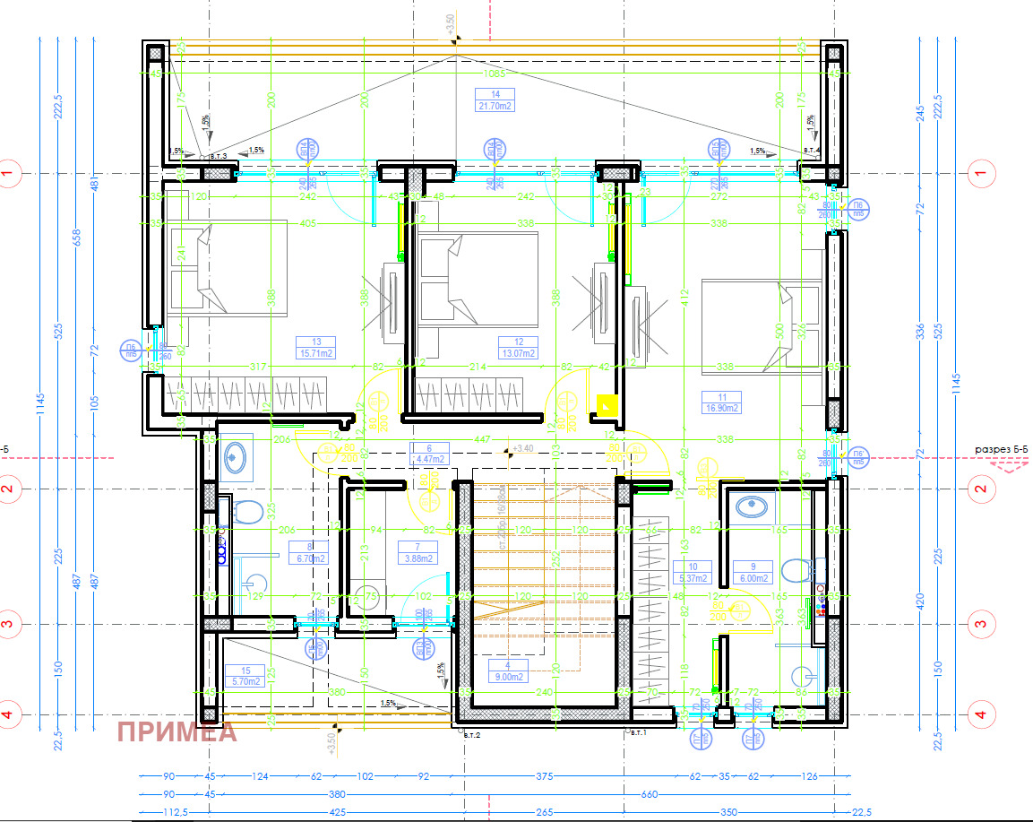 етаж 2: три спални, мокро помещение, две бани с тоалет, дрешник и тераса.