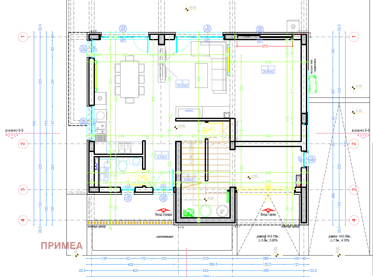 Има възможност за преустройство на помещенията на първия етаж, като вместо гараж, се обособи по-голяма дневна зона.