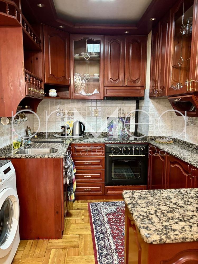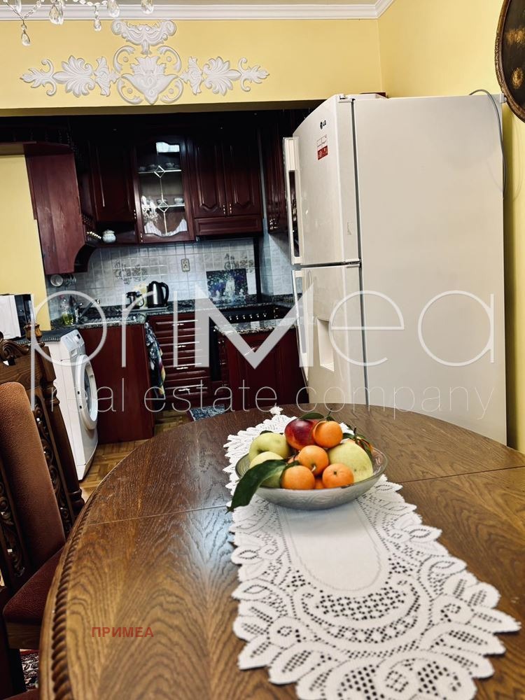 ПРИМЕА отдава под наем апартамент с три спални и гараж в центъра на гр. Бургас, до църквата 'Кирил и Методий'. Жилището се намира на 2-ри етаж /първи жилищен над магазини/ в тухлена сграда с асансьор. Имотът е изключително просторен и функционално разпределен. Състои се от голяма всекидневна с кухненски бокс, с обособени кътове; три спални; две санитарни помещения; широк коридор. Всяка стая има излаз на тераса. Обзавеждането е решено в класически стил, с естествени подови настилки и мебели от масив. Отдава се обзаведен. Отоплението е локално парно на ток, с изградена система във всички стаи. Има и климатици.