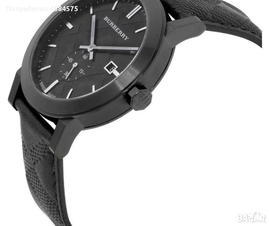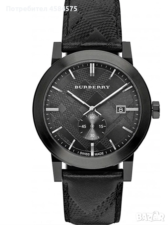 Нов Стилен мъжки часовник Burberry с изчистен, модерен дизайн. Черен корпус и циферблат с характерния Burberry мотив, кожена каишка, дата на 3 часа и малък секундомер. Swiss Made, кварцов механизъм – елегантен избор за всекидневие и официални поводи.
