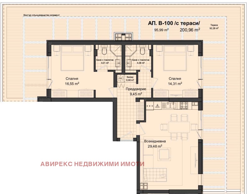 Разпределение: Дневна с трапезария и кухненски бокс, 2 спални, 2 бани с wc, килер, тераса