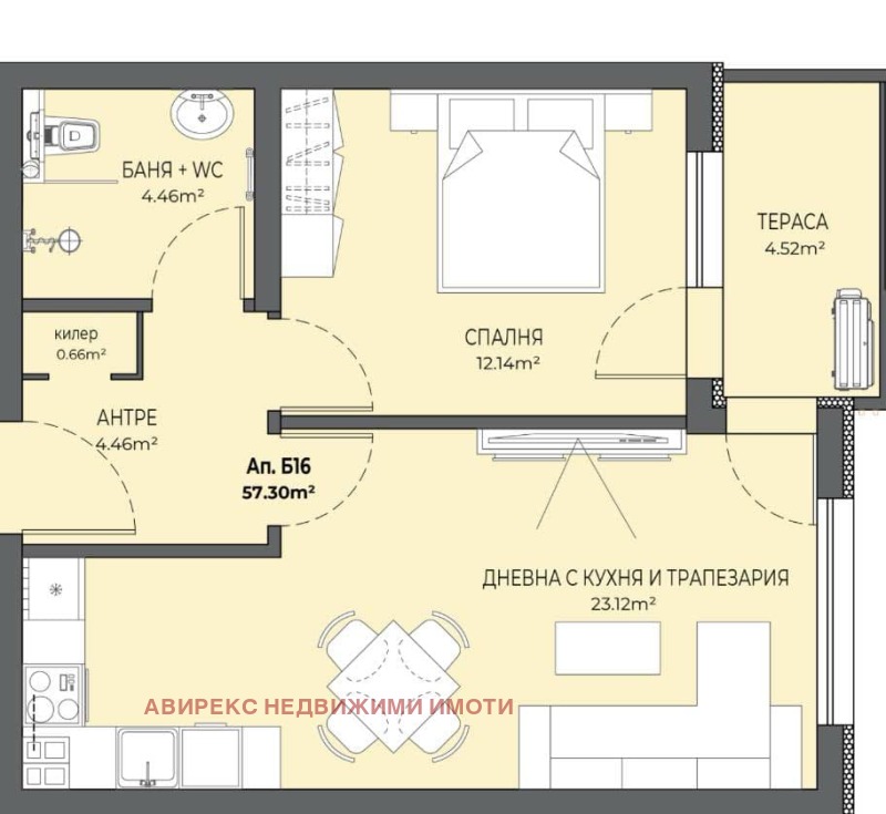 Жилището е с площ от 65 кв.м. и разполага с функционално разпределение: хол с кухненски бокс, спалня, баня с тоалетна и тераса.