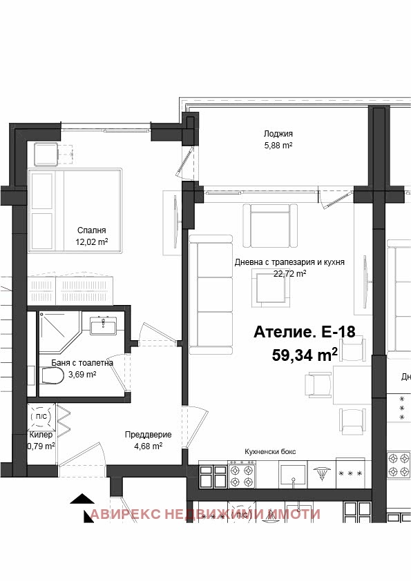 Разпределение: Дневна с трапезария и кухненски бокс, баня с wc , килер