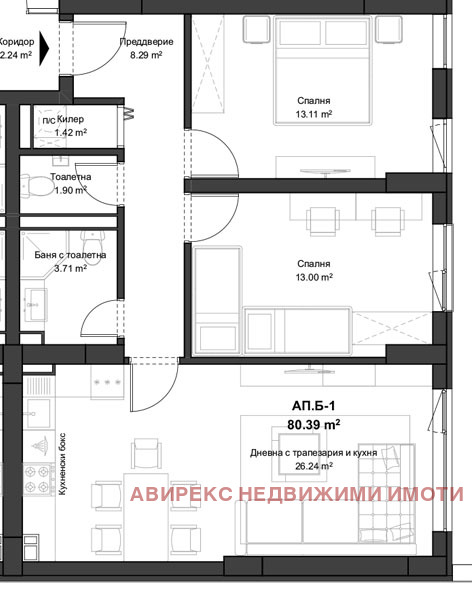 Разпределение: Преддверие /8.29м2/; Килер /1.42м2/; Баня с тоалетна /3.71м2/; Тоалетна /1.90/; Дневна с трапезария и кухня /26.24м2/; Спалня /13.11м2/; Спалня /13.00м2/