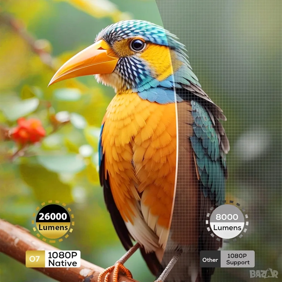 * Изключителна яркост и контраст: С впечатляваща яркост от 26 000 лумена и контрастно съотношение 20 000:1, AKIYO O7 гарантира дълбочина на черния цвят и яснота на изображението. Вградената технология за защита на очите минимизира вредното въздействие на синята светлина.