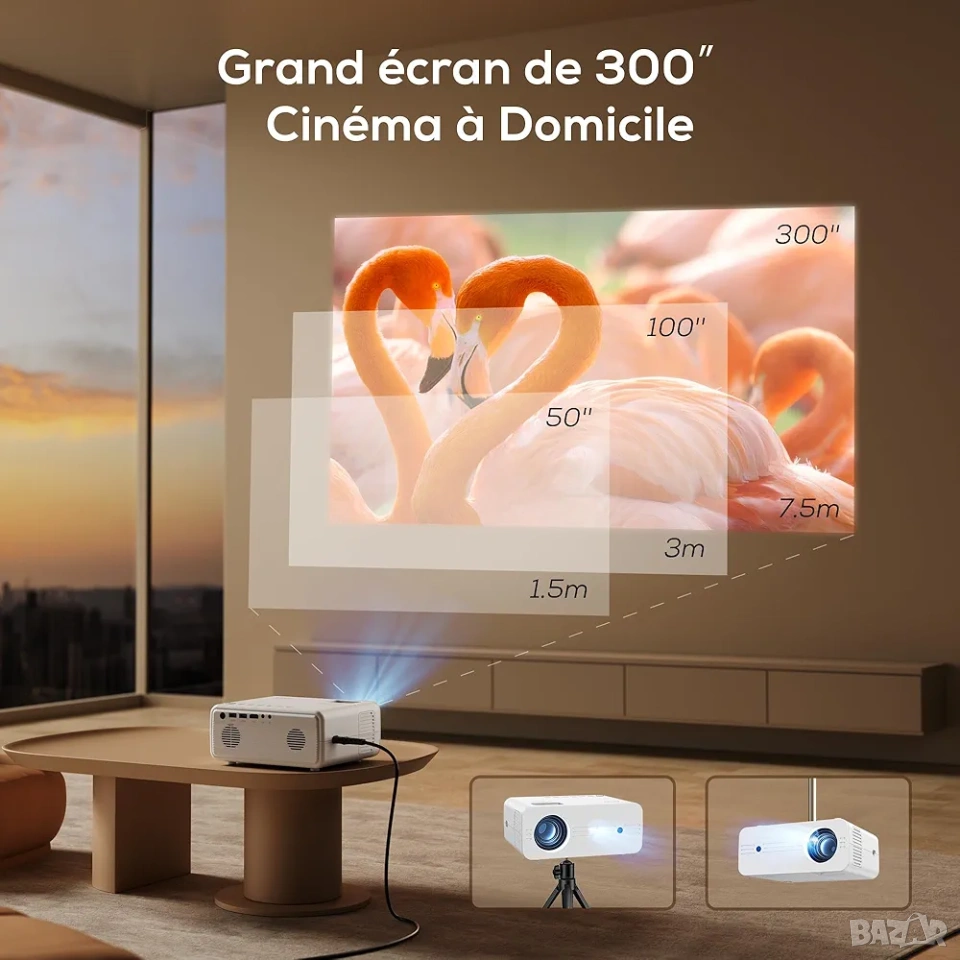 * Голям екран и мащабиране: Поддържа размер на проекцията до 300 инча при разстояние от 1.2 до 3.4 метра. Функцията за 75% зуум позволява регулиране на размера на екрана без необходимост от физическо преместване на устройството.