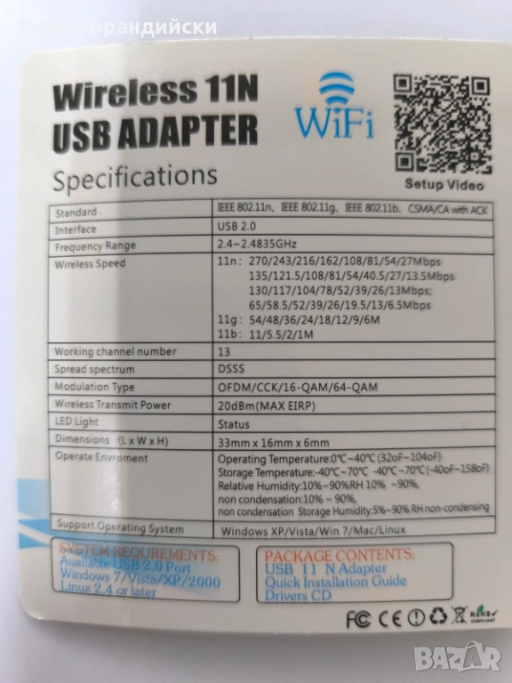 Продавам USB WiFi адаптер (антена) с чип Realtek RTL8188FTV. Подходящ за компютър/лаптоп, когато няма WiFi карта.