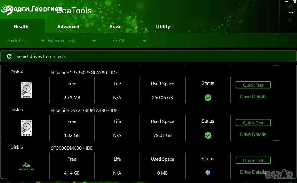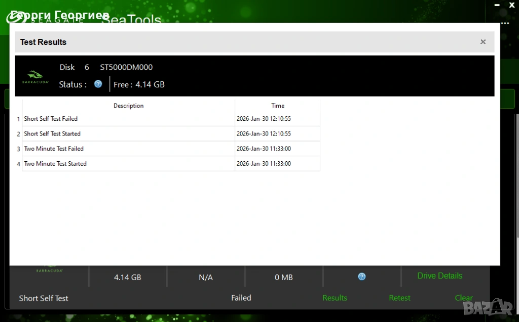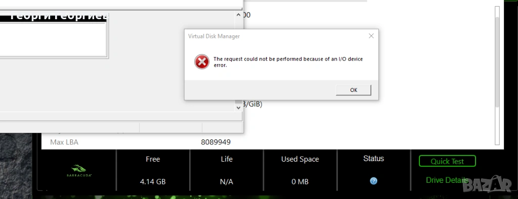 Диска се разпознава под Windows. Щом тръгне компютъра диска изщраква два пъти развърта се и се чува как спира да се върти. Под Seatools не минава нито един тест. Продавам го за 15 евро само с лично предаване в София, Люлин 8 до 56то училище. Не изпращам с куриер.