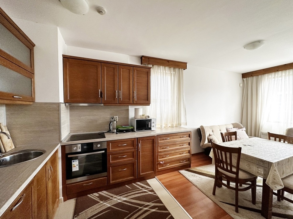 Апартамента е напълно обзаведен и се състои от всекидневна, три спални, две бани, мокро помещение и двабалкона. Кухнята заедно с хола е голяма и напълно оборудвана с фурна, котлони и абсорбатор. Има и хладилник. Във всекидневната са разположени голям диван и трапезна маса.