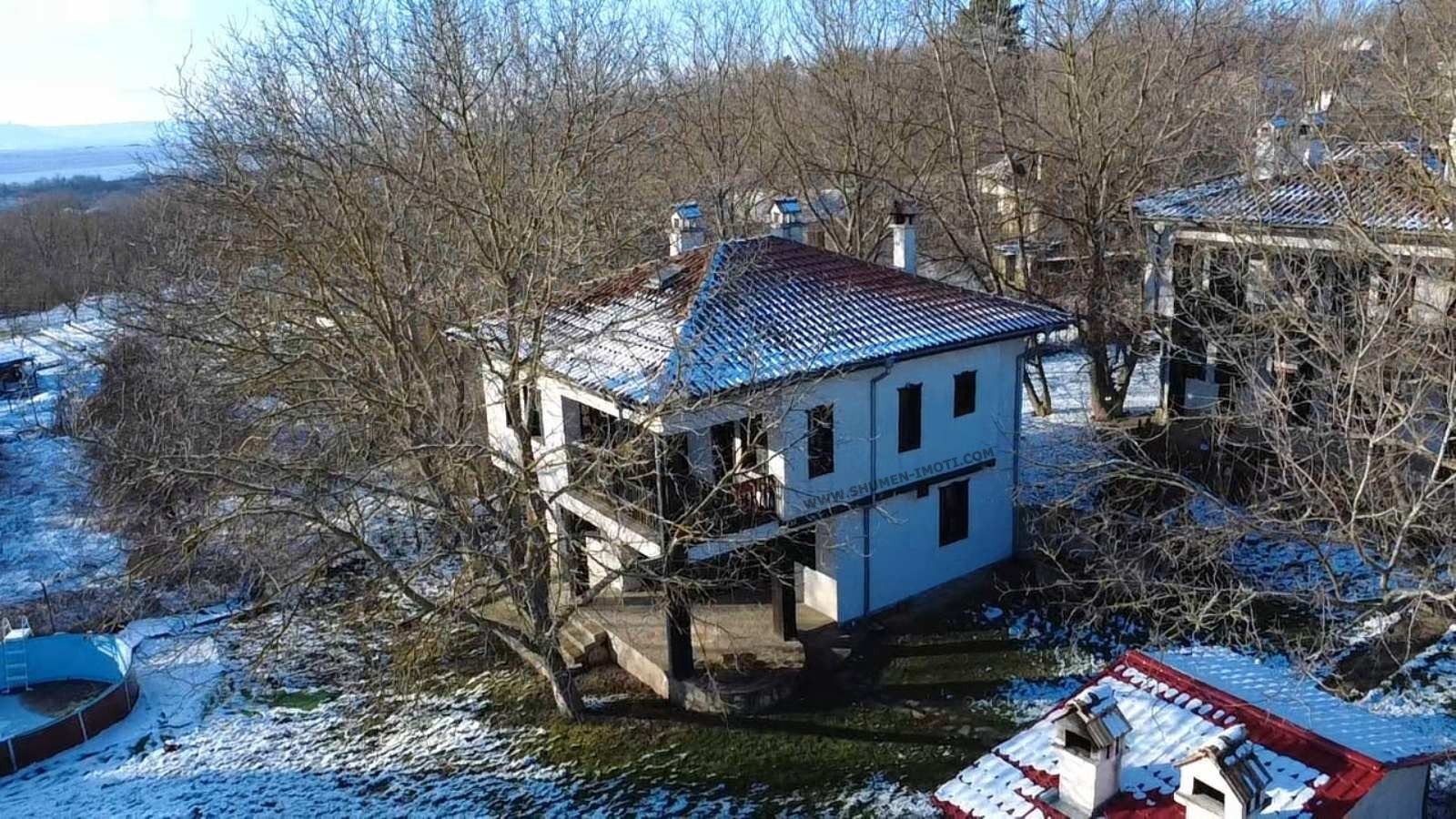 Обширният двор от 1800 кв. м е равен и отлично поддържан. В него са обособени барбекю зона с пещ и сглобяем басейн чудесни за отдих и забавления през топлите месеци 🍖🏊♂️.