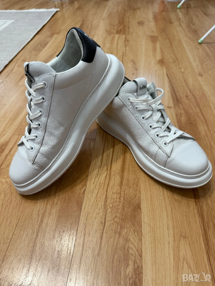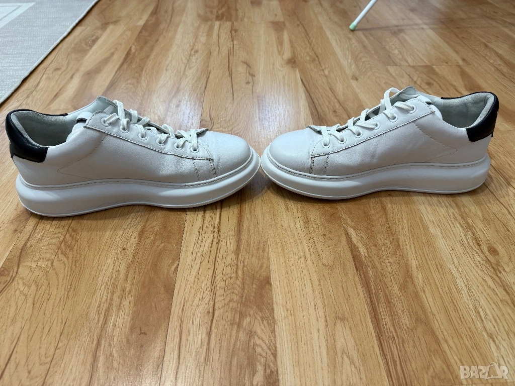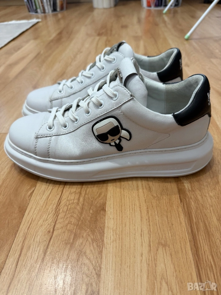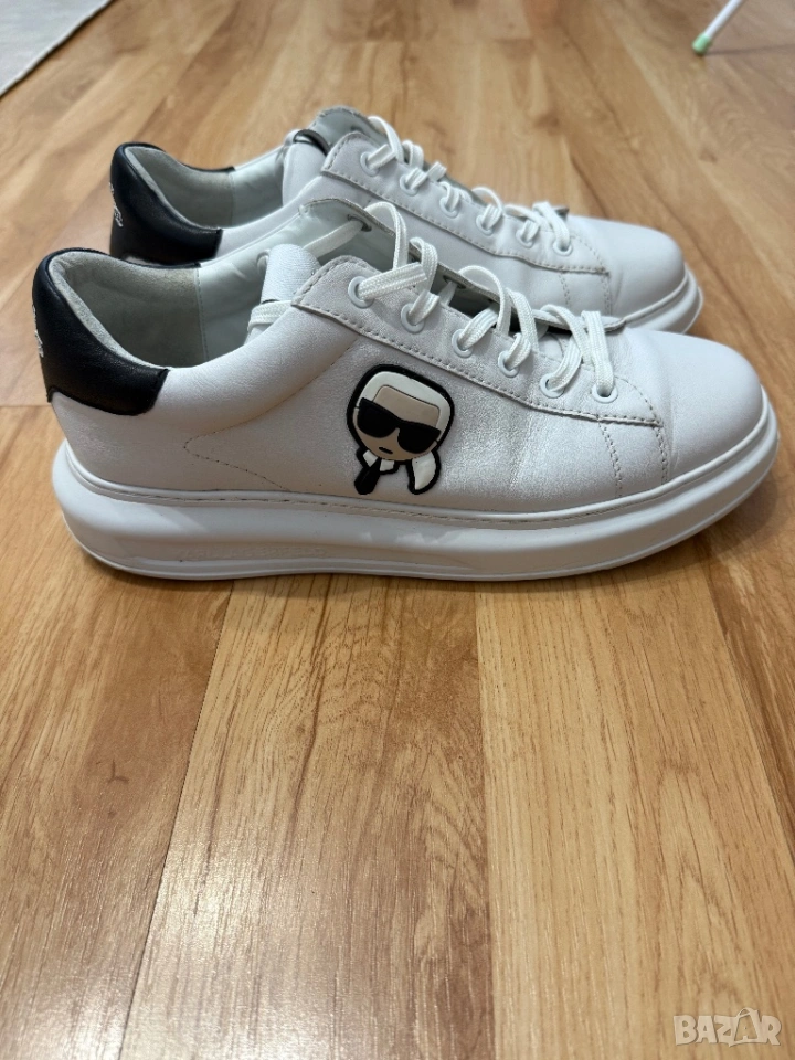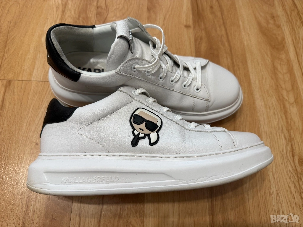 Оригинални мъжки сникърси на Karl Lagerfeld от естествена кожа в бял цвят. Изключително стилни и подходящи за различни поводи. Кецовете са изключително запазени, тъй като са носене броени пъти. 100 % оригинални, закупени от магазин представител на марката. Размер 43. Цена 60 евро.