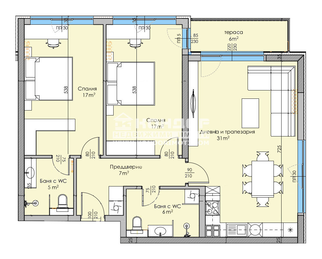 Оферта 62859 - Предлагаме Ви възможността да закупите просторен 3-стаен апартамент в луксозна жилищна сграда с модерна визия, проектиран да създаде максимален комфорт на живущите в него. Основната концепция e премиум строителство, отличаващо се със съвременен архитектурен дизайн и европейска визия. Едно от основните му предимства е страхотната локация, разположен на пешеходна близост до Централна градска част, съчетаващо лукс спокойствие и комфорт. Жилището се състои от просторна дневна - 31кв.м. с трапезария и кухненски бокс, две самостоятелни спални по 17кв.м, една тераса, две бани с тоалетни и широк и функционален коридор. Към апартамента има прилежаща изба. Основната концепция при проектирането е да се постигнат просторни и функционални стаи с цел да се създаде максимален уют на модерното семейство. Изключителна съвременна архитектура и модерна технология на строителство. Визията е иновативна, привличаща внимание с уникалността си. Безопасна и сигурна среда за пребиваващите допълват комфорта на сградата. Всяко жилище разполага с пълно окабеляване за домофон, интернет и кабелна телевизия, общите части са луксозно завършени, а апартаментите са с алуминиева дограма с троен стъклопакет от най-висок клас, както и масивна блиндирана входна врата. За удобство на живущите съществува възможността да закупят подземни и надземни паркоместа. Възможност за закупуване чрез Банков Кредит на изключително изгодни условия за клиенти на Агенцията!