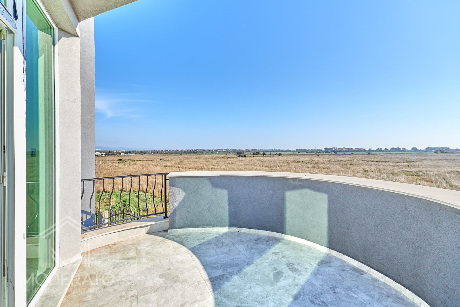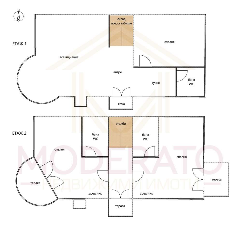 Втори етаж: две големи спални (по 22 кв.м.), гардеробни, две бани с тоалетни и тераси с гледка към околността.