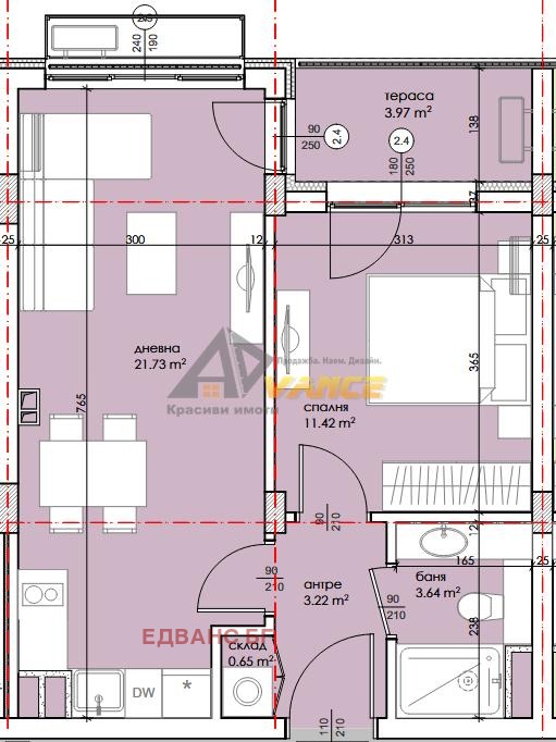 🛏️ Разпределение: входно антре, дневна с кухненски кът, спалня, баня с тоалетна, складово помещение, тераса