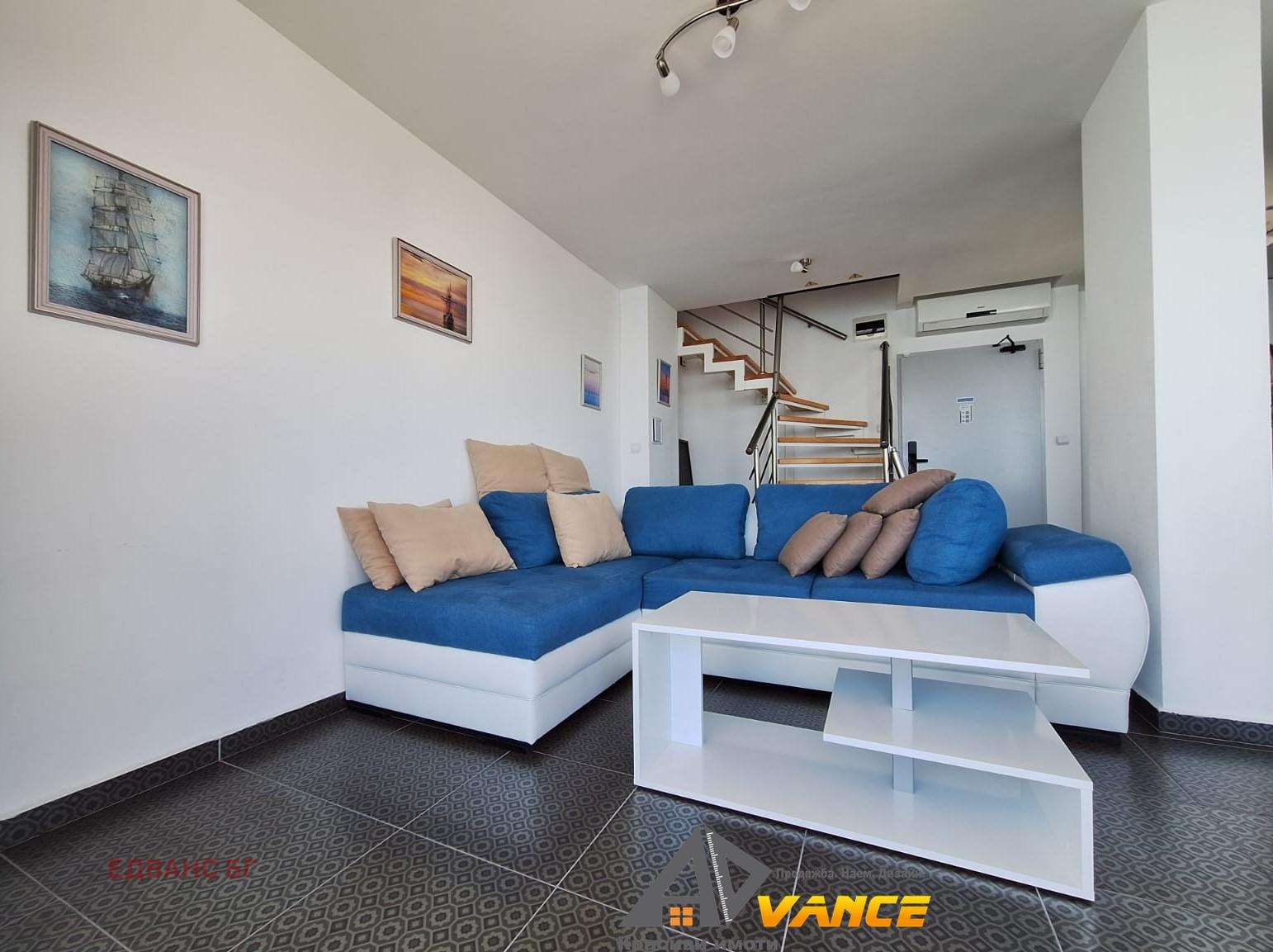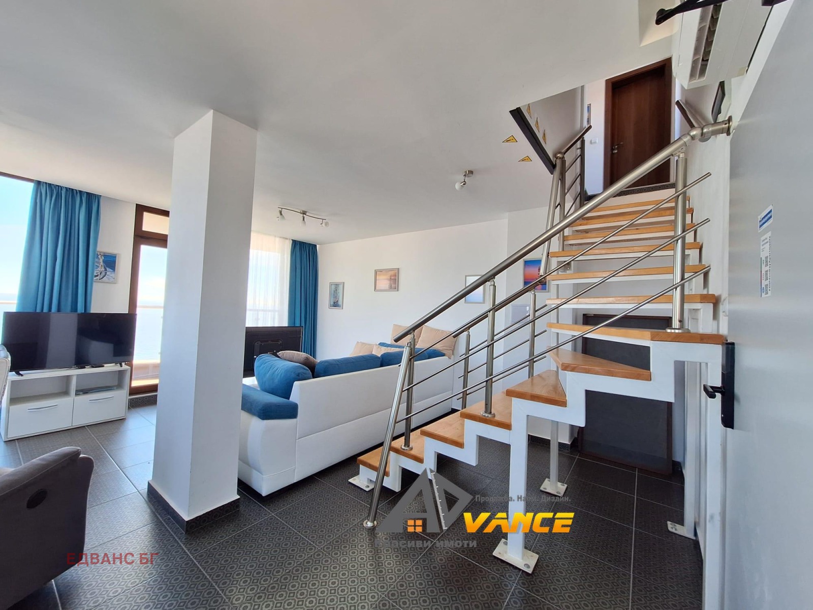 Продава се луксозен стилно обзаведен мезонет с 2 спални с фронтална гледка море. Нова бутикова сграда без такса поддръжка се намира на 1-ва линия в Равда