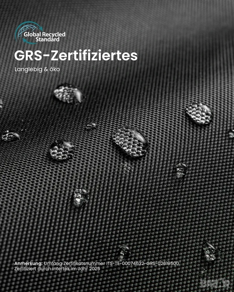 * Висококачествени и Еко материали: Изработена от здрави тъкани с GRS сертификат (Global Recycled Standard), използващи рециклирана пластмаса. Материята е водоустойчива и устойчива на износване.