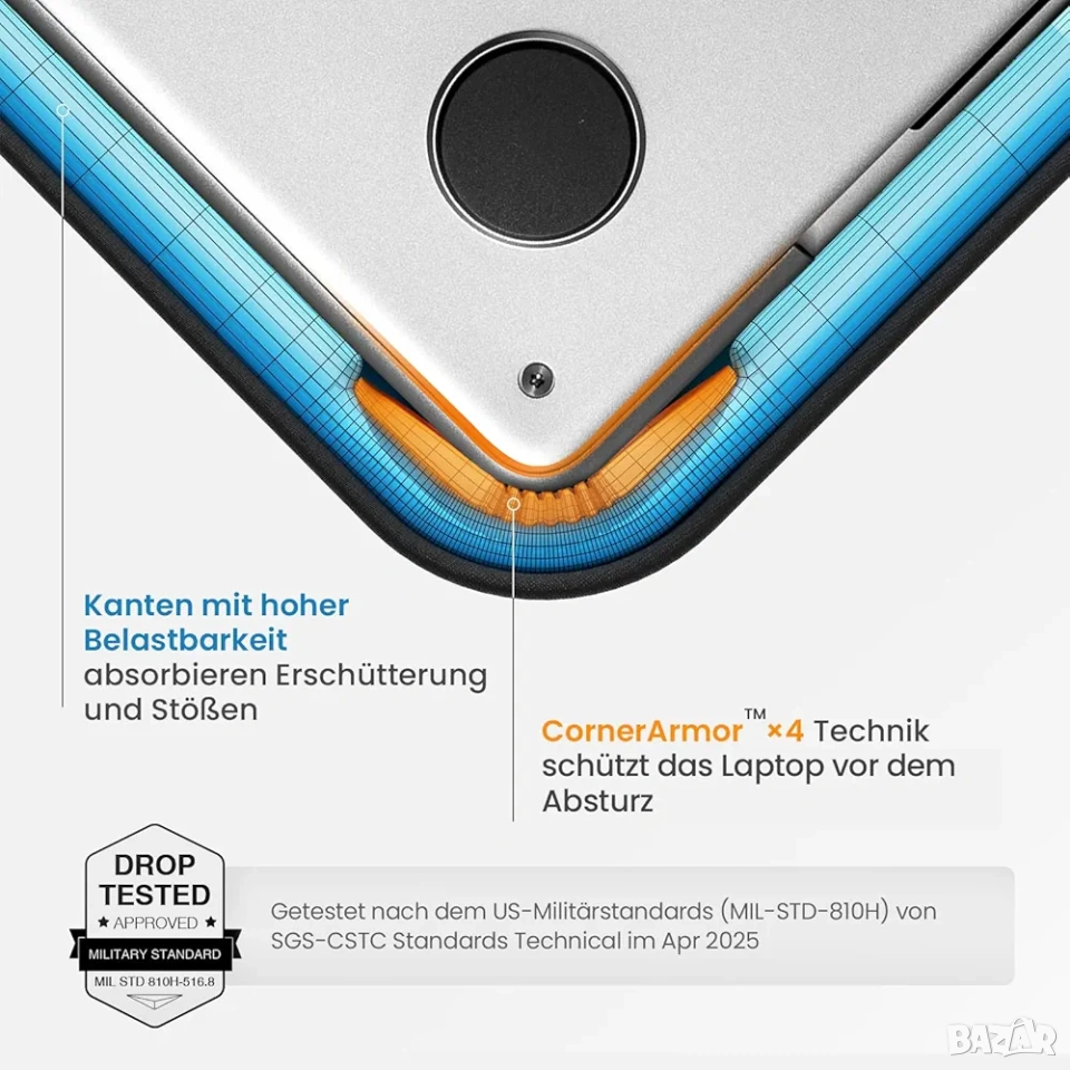 * Военен стандарт за защита (MIL-STD-810H): Чантата е преминала строги тестове за издръжливост при падане. Оборудвана е с патентованата технология CornerArmor™ x4, която подсилва четирите ъгъла с високоеластични елементи за абсорбиране на шока при удар.