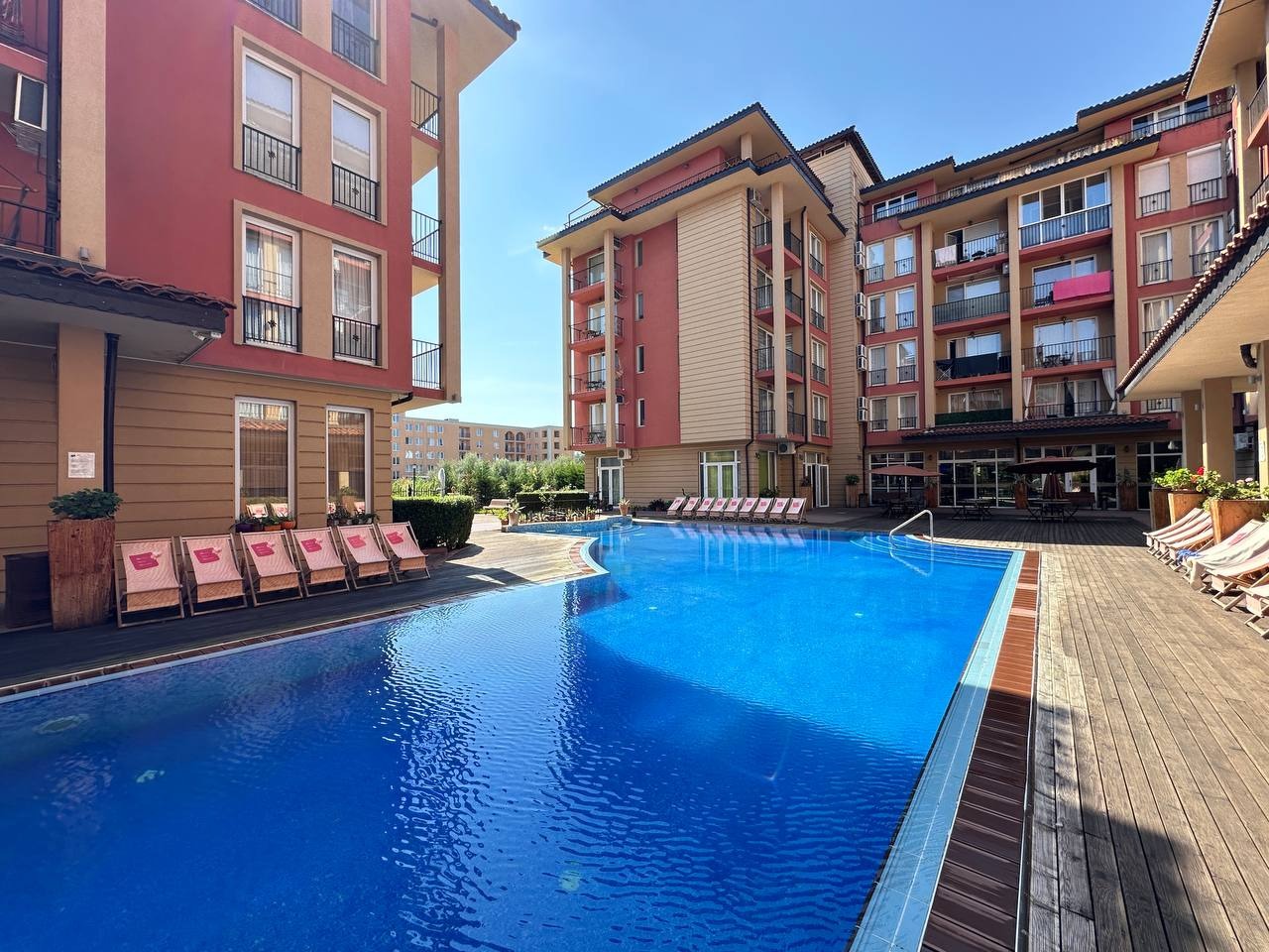 Sunny View Central се намира в тиха, централна част на Слънчев бряг, на 500 метра от плажа Cacao Beach, и е заобиколен от поляни с палми, където жителите се разхождат. На място има три басейна - единият с плитка зона за деца, фитнес център с фитнес уреди, спа център със сауна и масажни кабинети, както и ресторант с тераса и бар на брега на морето. Охраната е денонощна, паркингът е под видеонаблюдение, а детската площадка с въртележка е оживена с деца до вечерта. Супермаркет Джанет и крайбрежната алея със старите ѝ улички са само на крачки, което го прави удобно място както за релакс, така и за доходи от отдаване под наем.