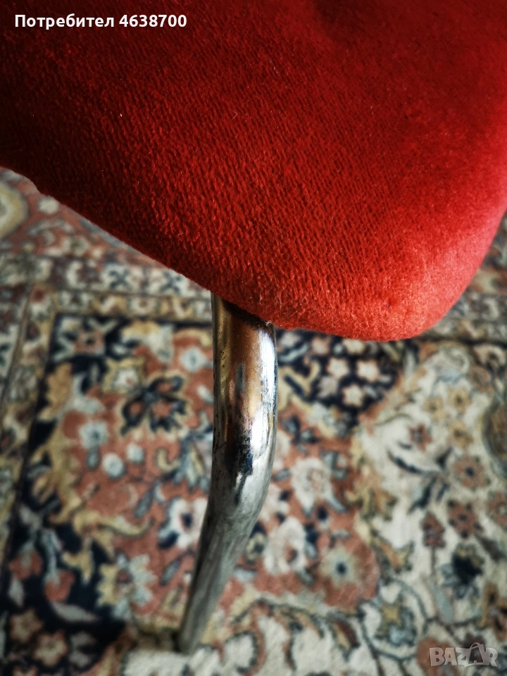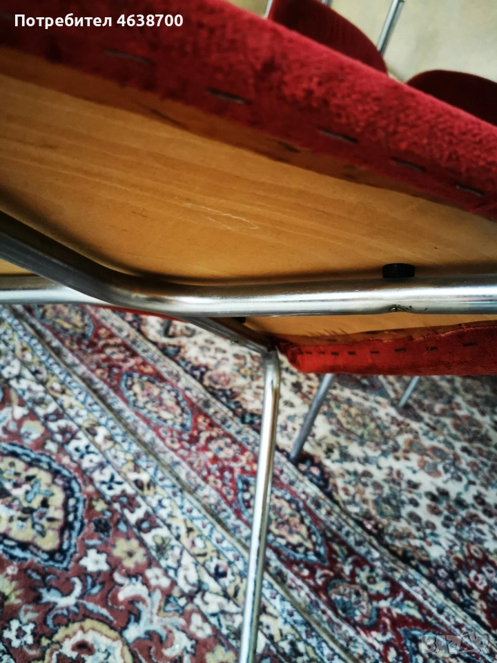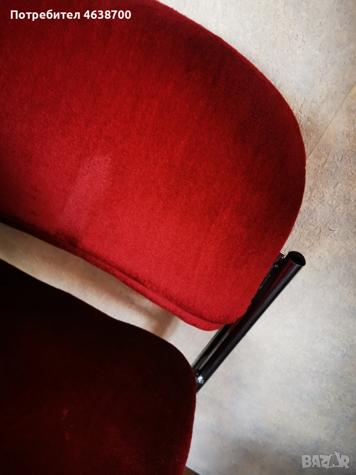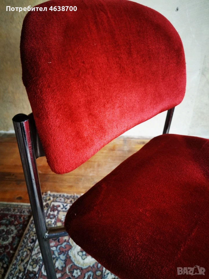 Продавам трапезни столове с пленена/кадифена тапицерия (червено, корал), дървена седалка и метална конструкция. На някои места имат малки недостатъци в следствие на ползването(виж снимка), които не се отразяват на функционалността им.