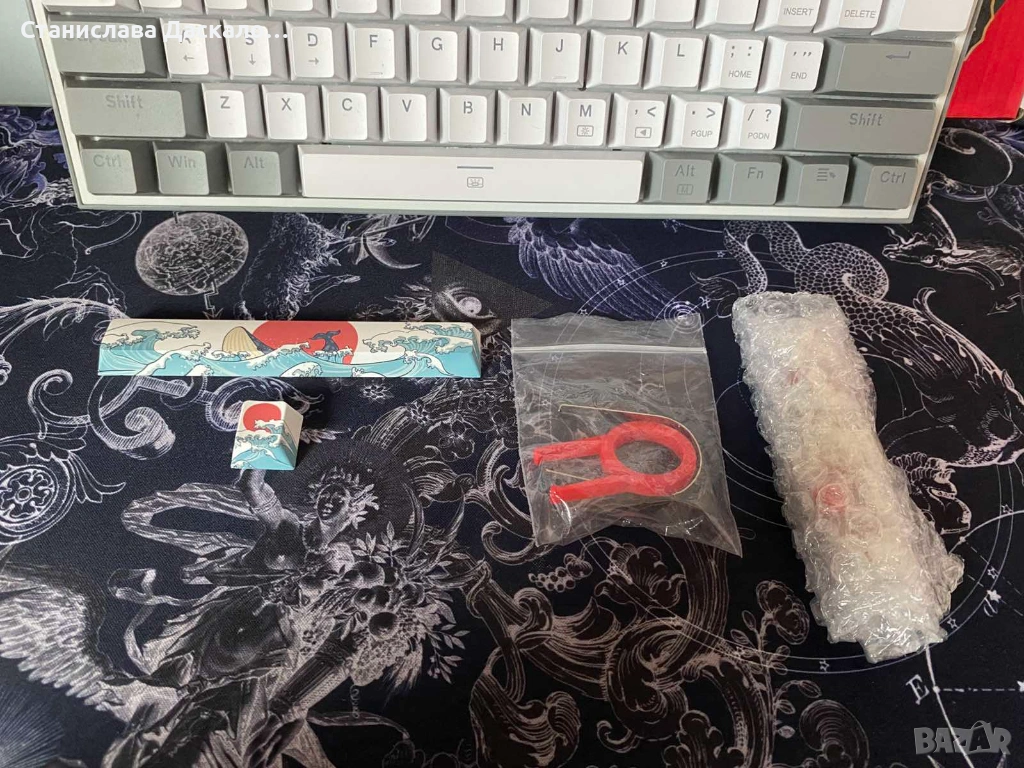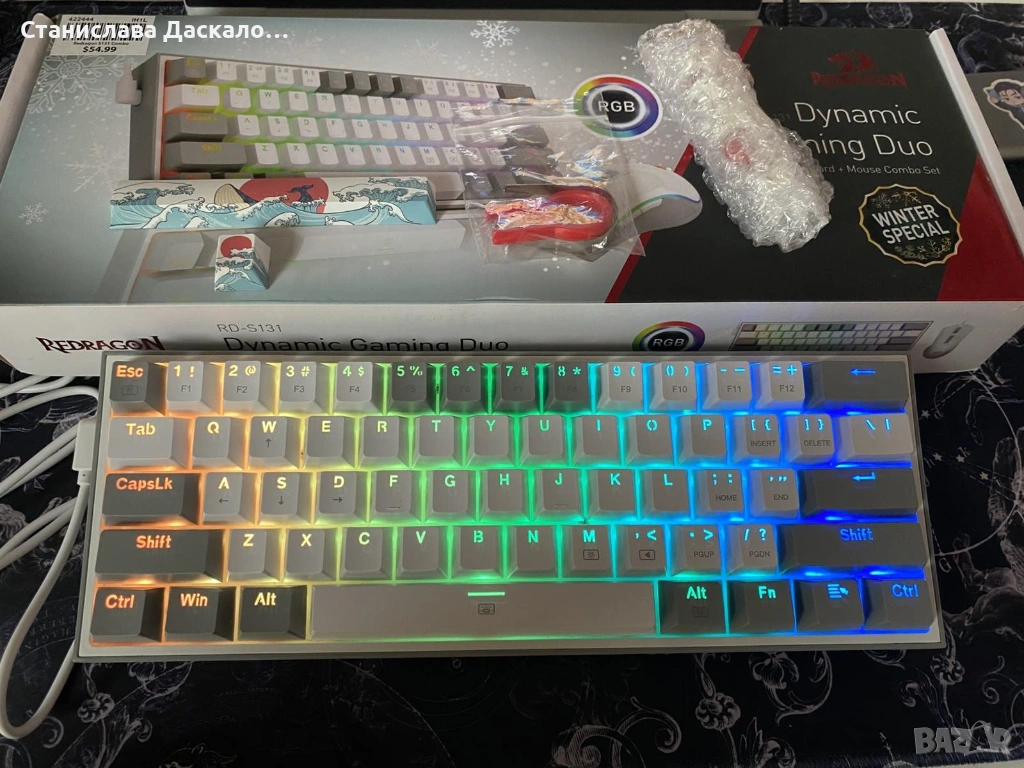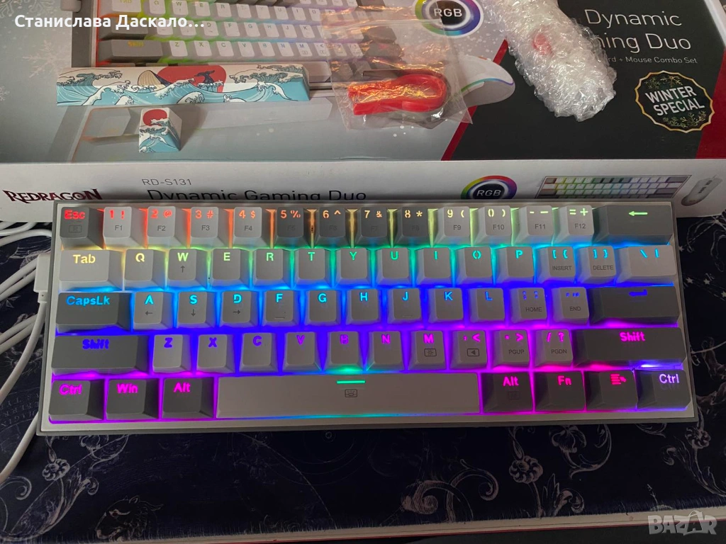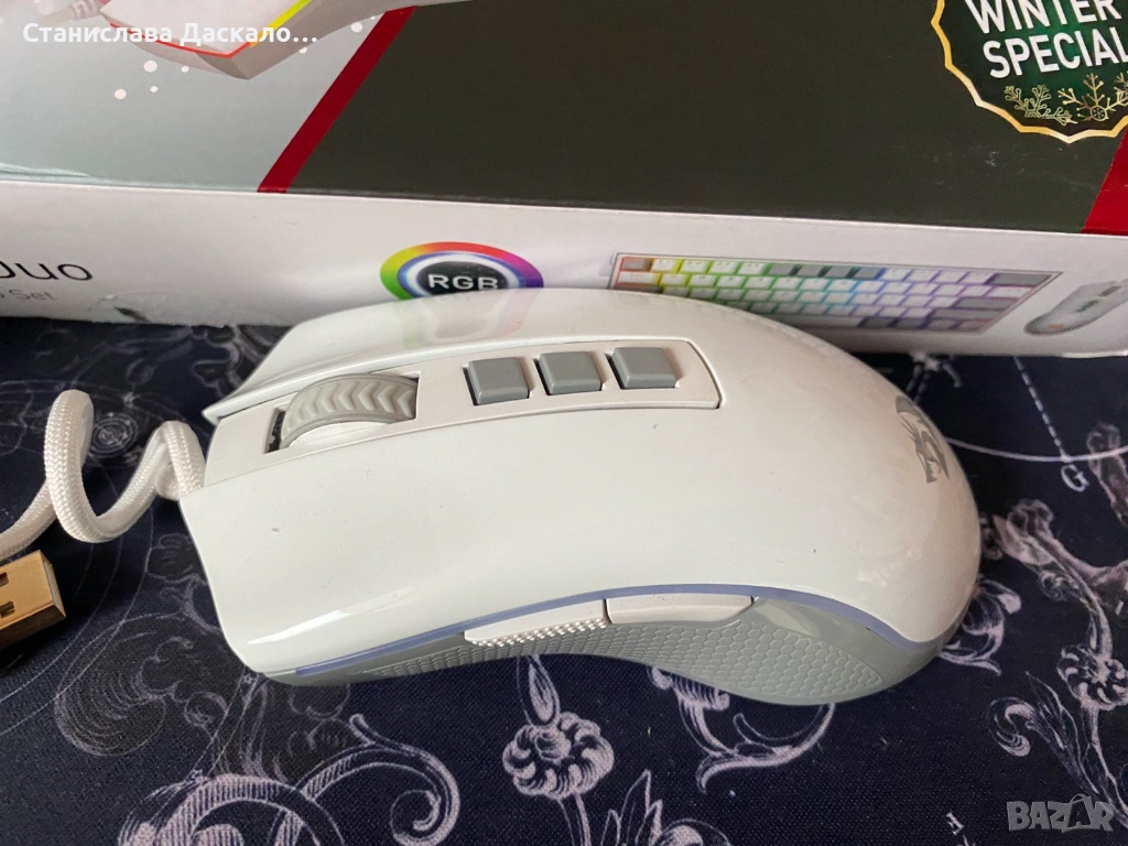 Гейминг комплект Redragon - Dynamic Duo RD-S131, бял/сив. Стилен и функционален комплект за геймъри, включващ мишка и механична клавиатура. Клавиатурата разполага с 11 режима на RGB осветление с контрол на интензитета, Red Dragon суичове и удобен USB-C конектор. Размерите са: 29.6 x 10.5 x 3.4 cm. Мишката разполага с 8 бутона, 5 режима на RGB осветление и USB кабел. Към комплекта подарявам: допълнителни червени суичове, две капачки за ESC + Space(съвместими с всички механични клавиатури) и инструменти за смяната на капачките. Клавуатирата е използвана много малко, а мишката само 2-3 пъти. И двете са в отлично състояние.