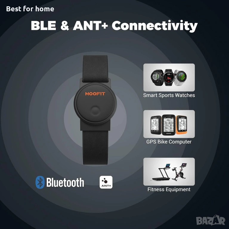 Двоен режим Bluetooth и ANT+: Пулсомерът се превръща във ваш фитнес тракер, свързва се с различни фитнес уреди и приложения. Независимо дали става въпрос за фитнес тренировка на открито, колоездене на закрито или групова тренировка, пулсът и консумацията на калории се определят прецизно.