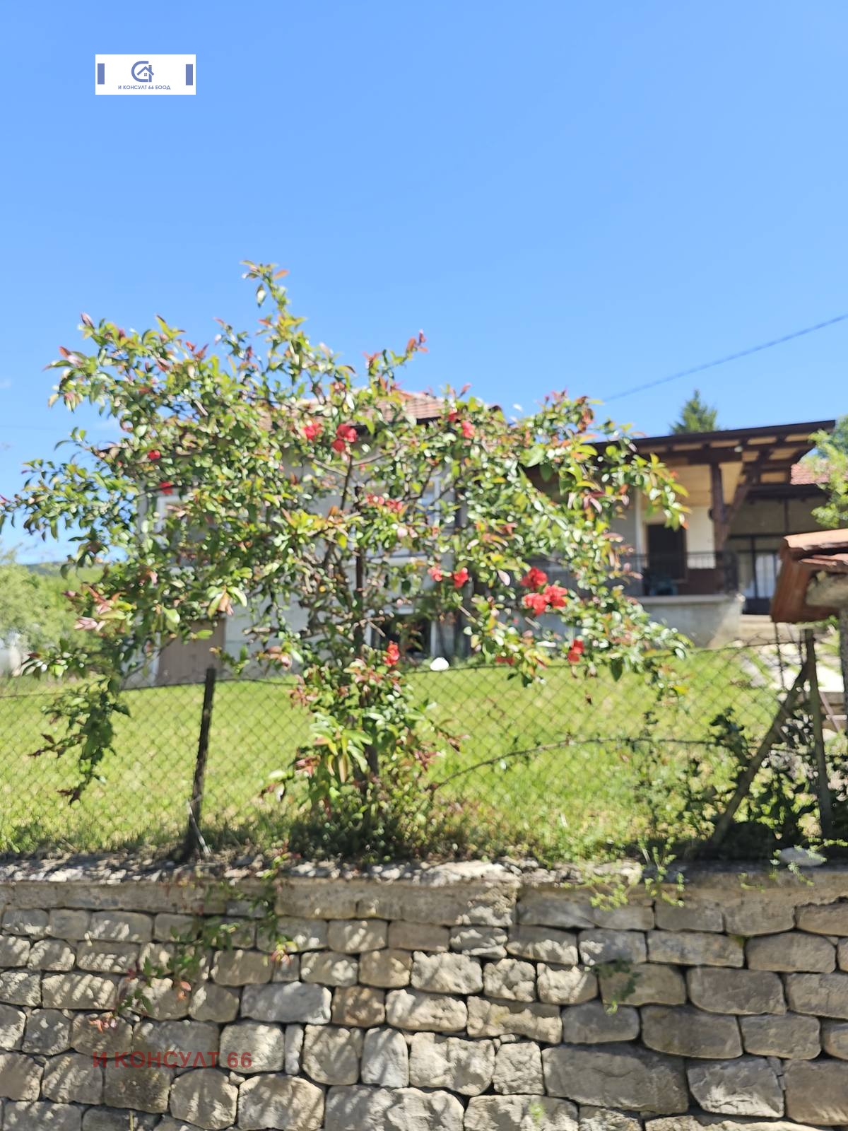 Дворът е поддържан, озеленен с овощни дръвчета и ограден с каменна ограда, слънчев е и има излаз на асфалтова улица.