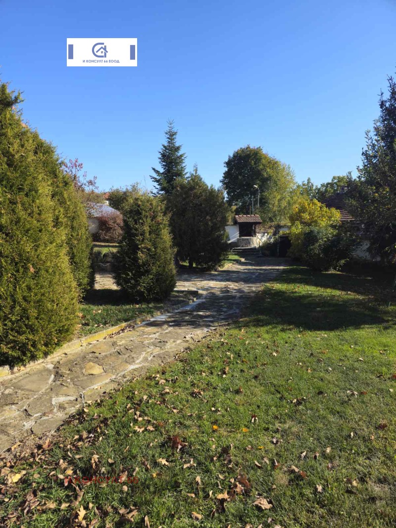 Равен, ограден, отлично поддържан, облагороден с овощни дръвчета цветя, много зеленина, големи ели, кипариси ДВОР. Пътеките за преминаване са облагородени и терасирани, постлани с камък и каменни плочи. Върху поддържаните зелени площи, има обособени кътове за отмора, релакс и съзерцаване на прекрасната гледка към Стара планина. Оградата е зидана с височина от 1.70 м. с врата за вход и на автомобили. В двора има още геран и парково осветление.