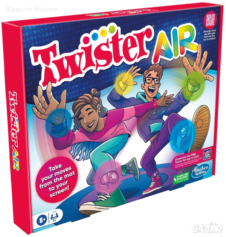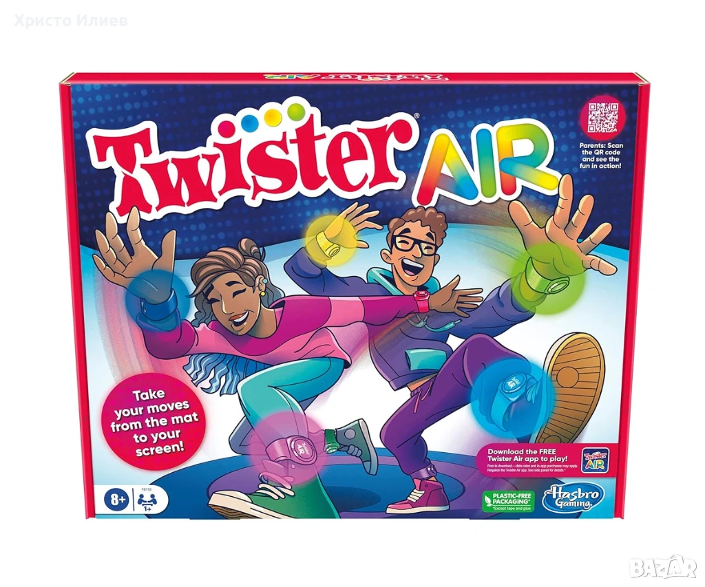 Няма постелка? Това е вярно! Правете движения от тепиха към екрана с играта Twister Air! В тази игра Twister, активирана от приложението, партито се премества върху смарт устройството на играча. Тази забавна парти игра включва 8 цветни ленти Twister Air и стойка за устройство, която работи с всеки смартфон или таблет. За да започнете, изтеглете приложението Twister Air (безплатно за изтегляне – може да се прилагат тарифи за данни и покупка в приложението) и поставете смарт устройство във включената стойка. Сканирайте QR кода в инструкциите, за да изтеглите и бързо да научите как да играете, да проследявате резултати и много повече! След това играчите поставят лентите на китките и глезените си и са готови за действие! Докато музиката свири, играчите движат тялото си, за да съпоставят лентите си с цветните петна на екрана. Докоснете, плъзнете, пляскайте и заемете луди пози. Колкото повече ударени точки, толкова по-висок е резултатът. Спечелете най-много точки, за да спечелите! Или играйте соло и се опитайте да победите миналия си рекорд. Търсите забавни парти игри? Тази игра с приложение за добавена реалност Twister Air е вълнуваща детска парти игра. Интерактивните игри са страхотни празнични подаръци за семейства и деца на възраст над 8 години. Включва 2 комплекта от 4 еластични, подходящи за всички ленти Twister Air за глезени и китки, плюс регулируема стойка, която държи смарт устройство по време на игра. В тази игра с приложения играчите могат да се смеят на глас, докато гледат себе си и опонента си, докато играят. Запазете любими моменти на смарт устройство, за да ги гледате по-късно.