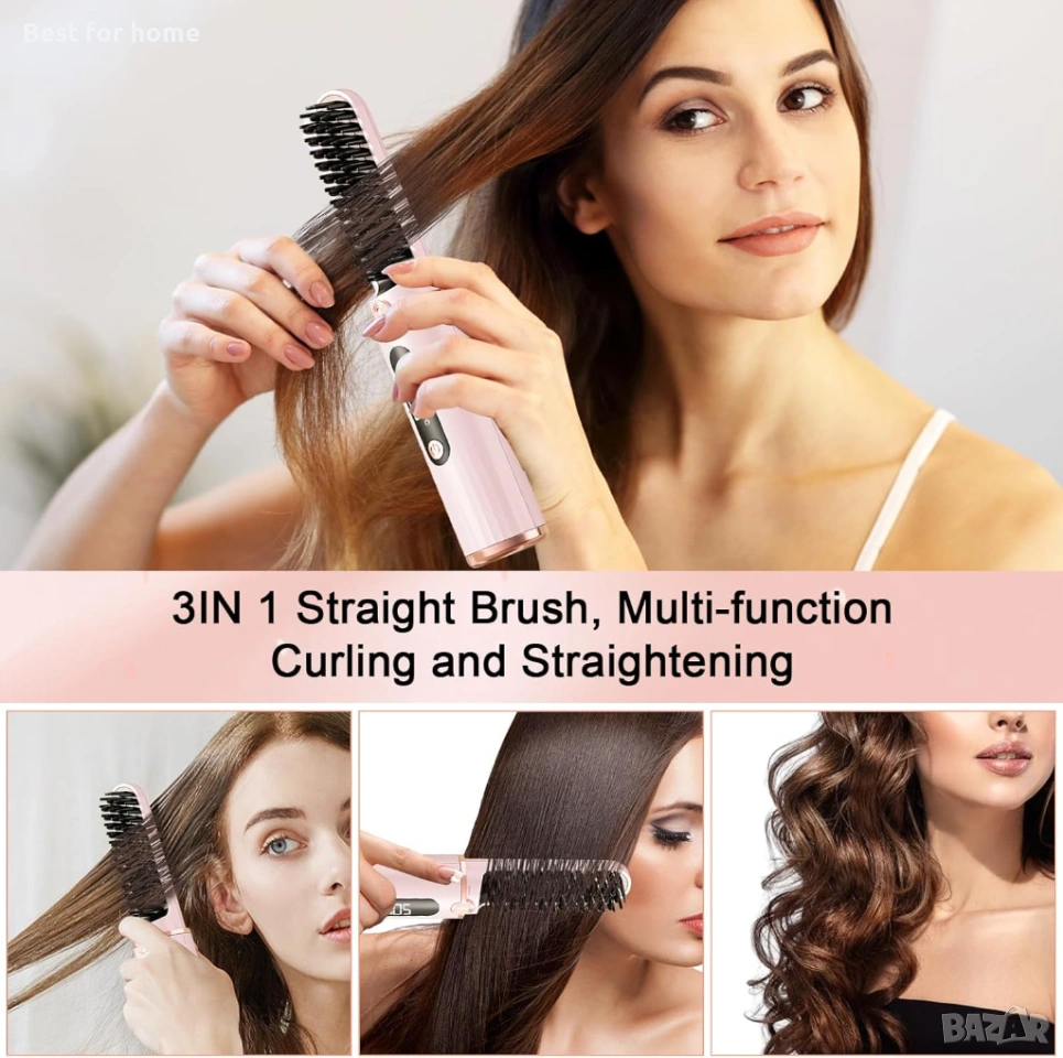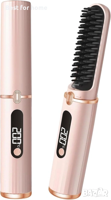 Безжична четка за изправяне на коса, преносима за пътуване, преса за брада с 4 температурни настройки, 140-200 °C, гребен с отрицателни йони, презареждащ се (розов).