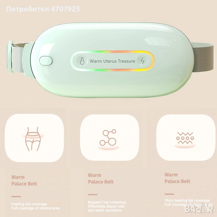 Колан за масаж и загряване, против менструални болки, лумбални болки, с 3 програми за вибрационен ма → Обява 53316768