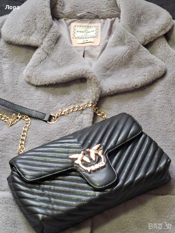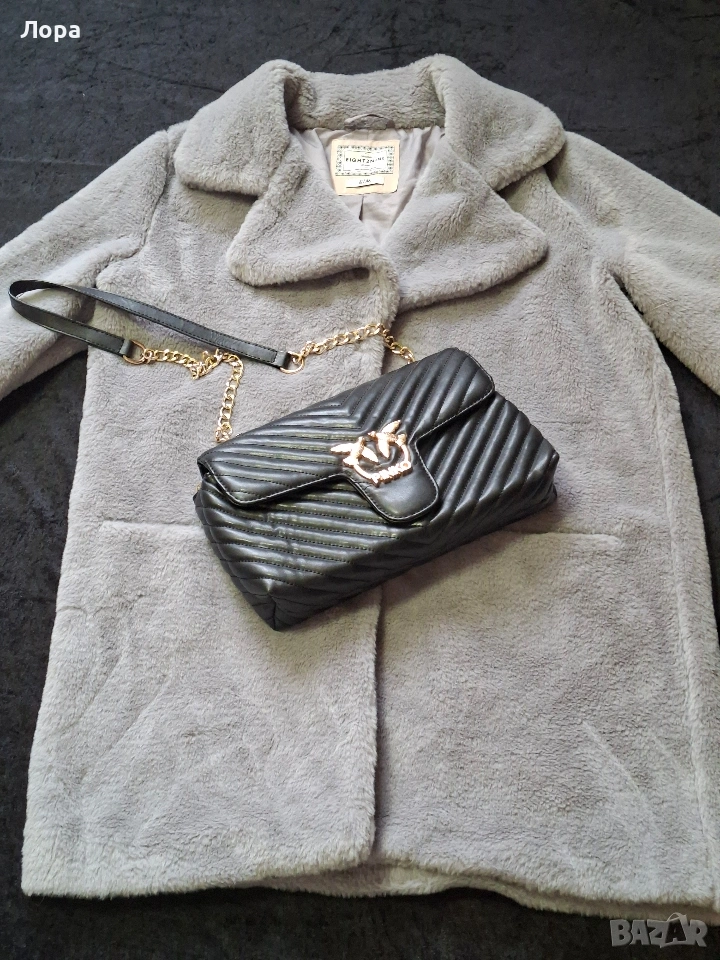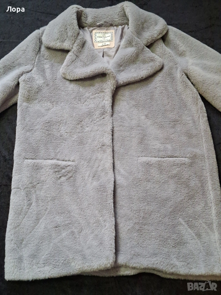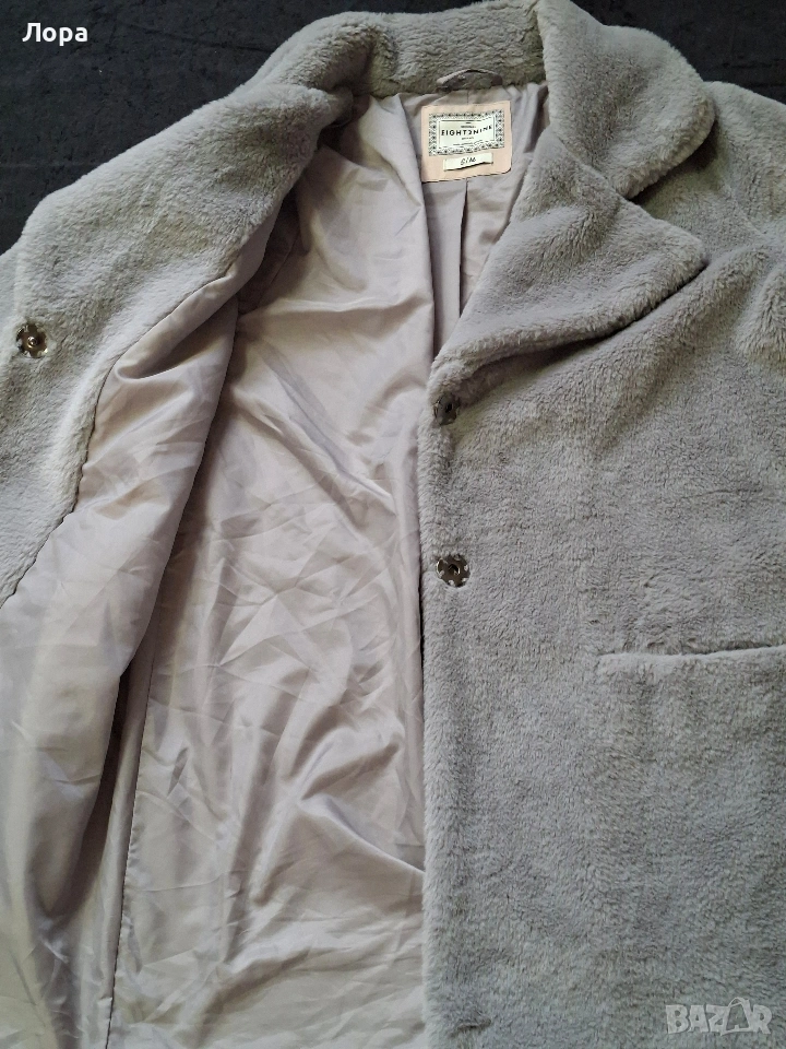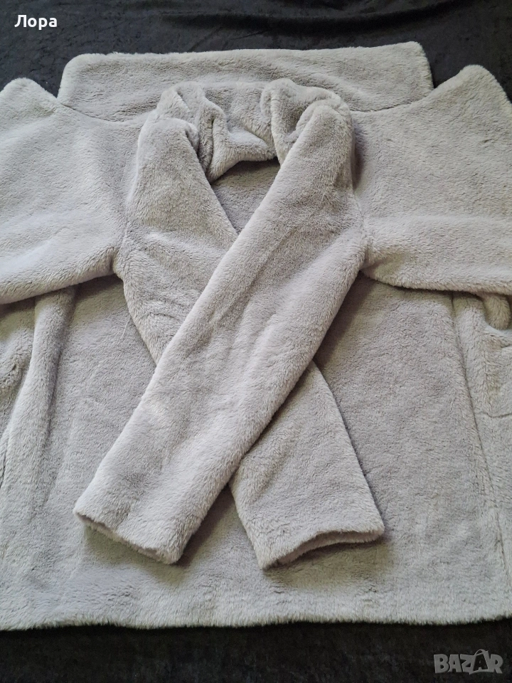 Дамско пухено палто в сив цвят. Подходящо за пролет и есен. Палтото е свободен модел с хастар 2 копчета и 2 външни джоба. Размери ширина от мишница до мишница 60 см. от рамо до рамо 50 см. дължина на ръкава 62 см. дължина на палтото 82 см. Изпращам с опция преглед и тест по Еконт. Палтото няма забележки.