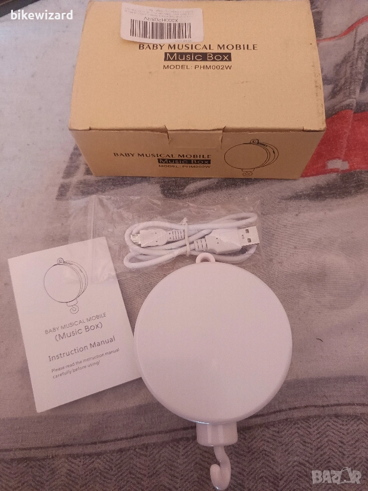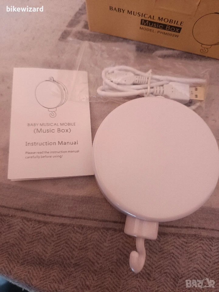 Инсталирайте я на бебешко креватче/легло с подлакътници/скоба, закачете играчките на куките. Играчките ще се въртят, докато се възпроизвежда музика. Включване/Изключване: Натиснете продължително левия червен бутон за 3 секунди. Пусване/Пауза: Натиснете кратко левия червен бутон. Циклично възпроизвеждане на единична песен /Цикличен плейлист: Натиснете кратко десния червен бутон. Превключвател за разделяне на музиката/въртенето: Натиснете продължително десния червен бутон за 3 секунди. Предишна песен: Натиснете кратко левия зелен бутон. Следваща песен: Натиснете кратко десния зелен бутон. Намаляване на звука: Натиснете продължително левия зелен бутон за 2 секунди. Увеличаване на звука: Натиснете продължително десния зелен бутон за 2 секунди. Скобите/ръцете и играчките не са включени, но се предлагат на пазара. Размери: 7,9 см дължина x 7,9 см ширина x 3,9 см височина