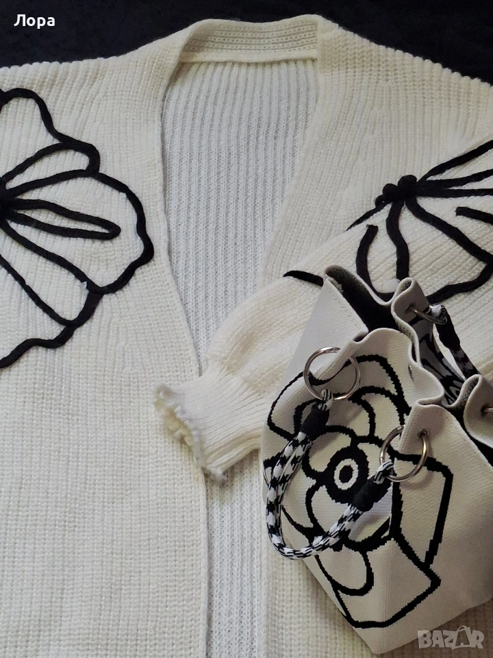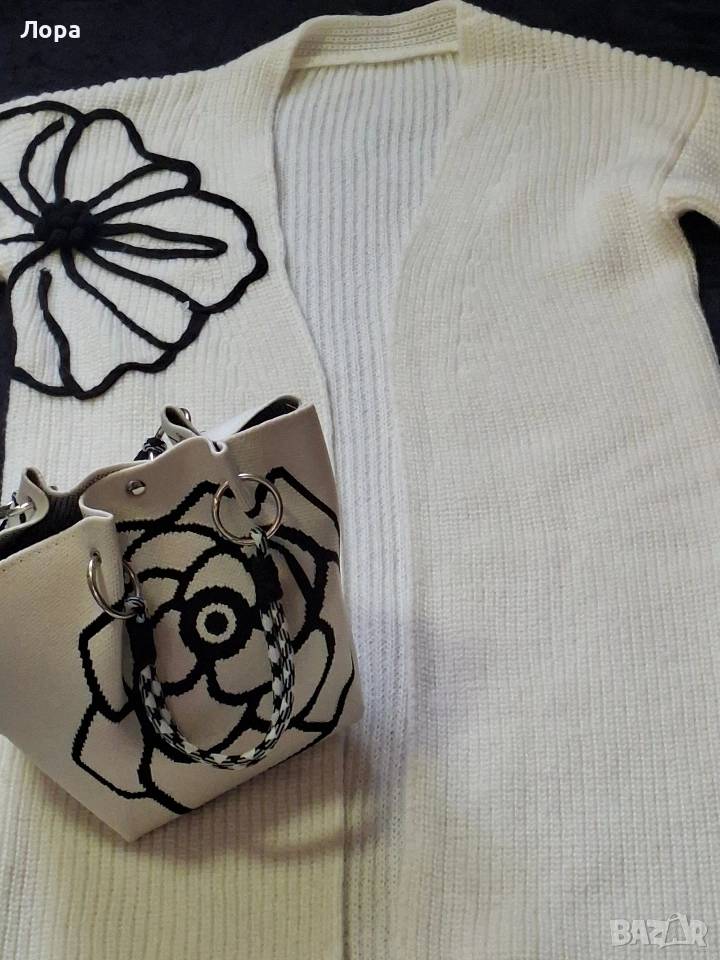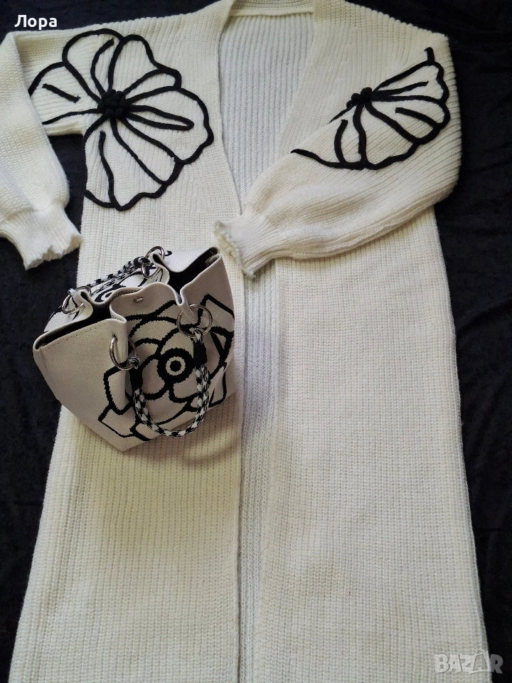Дълга дамска жилетка в комплект с чанта. Жилетката е свободен модел без закопчаване. Размери ширина от мишница до мишница 50 см. дължина на ръкава 55 см. дължина на жилетката 120 см. И жилетката и чантата са нови. Изпращам с опция преглед и тест по Еконт.