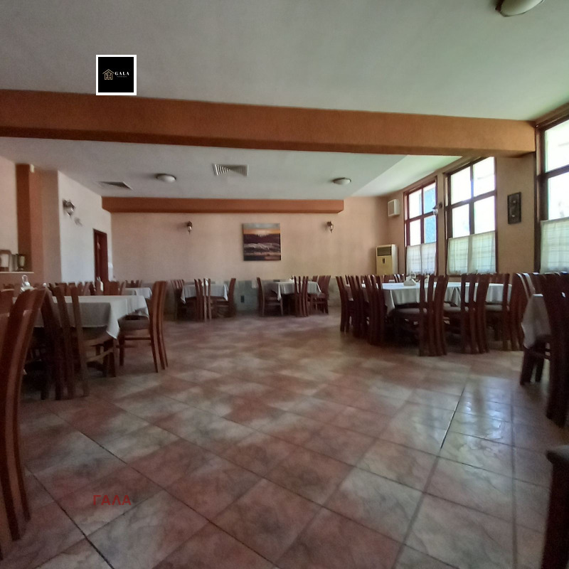 - Първи етаж: ГОЛЯМО ТЪРГОВСКО ПОМЕЩЕНИЕ със статут РЕСТОРАНТ със ЗП от 345 кв.м, състоящ се от две зали за посетители, студена и топла кухня, миялно и перално помещение, 3 склада - за хранителни продукти, алкохол и безалкохолно и за дърва, битовка със съблекалня за персонала, служебна баня с тоалет, 4 санитарни помещения за посетители.