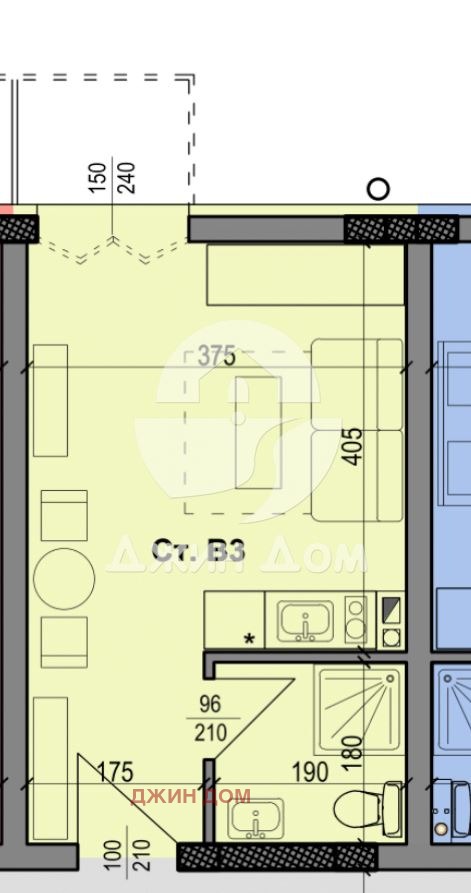 Апартаментът има следното разпределение: антре, просторен хол с кухненски бокс и място за трапезария, баня с тоалетна и душ, веранда с излаз към комплекса.