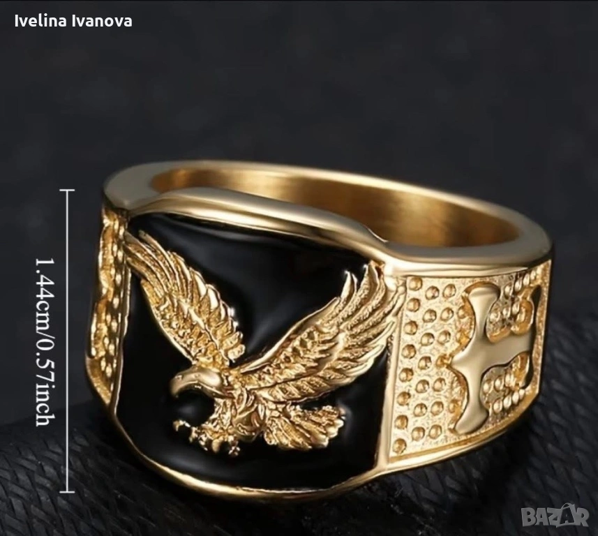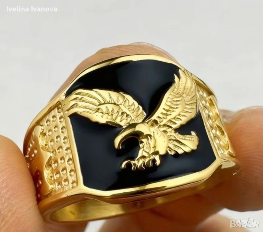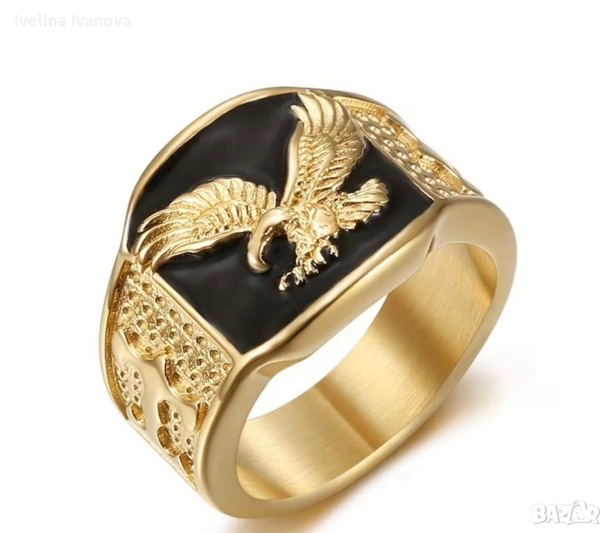 Ефектен мъжки пръстен със златисто покритие и черен фон, украсен с релефен орел – символ на сила, свобода и увереност. Масивен дизайн, който се откроява и допълва перфектно всеки стил – от ежедневен до по-елегантен.