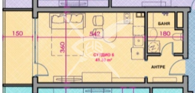 РАЗПРЕДЕЛЕНИЕ: Жилището разполага с площ 41.33 кв.м., състои се от едно основно помещение с кухня, коридор и баня.