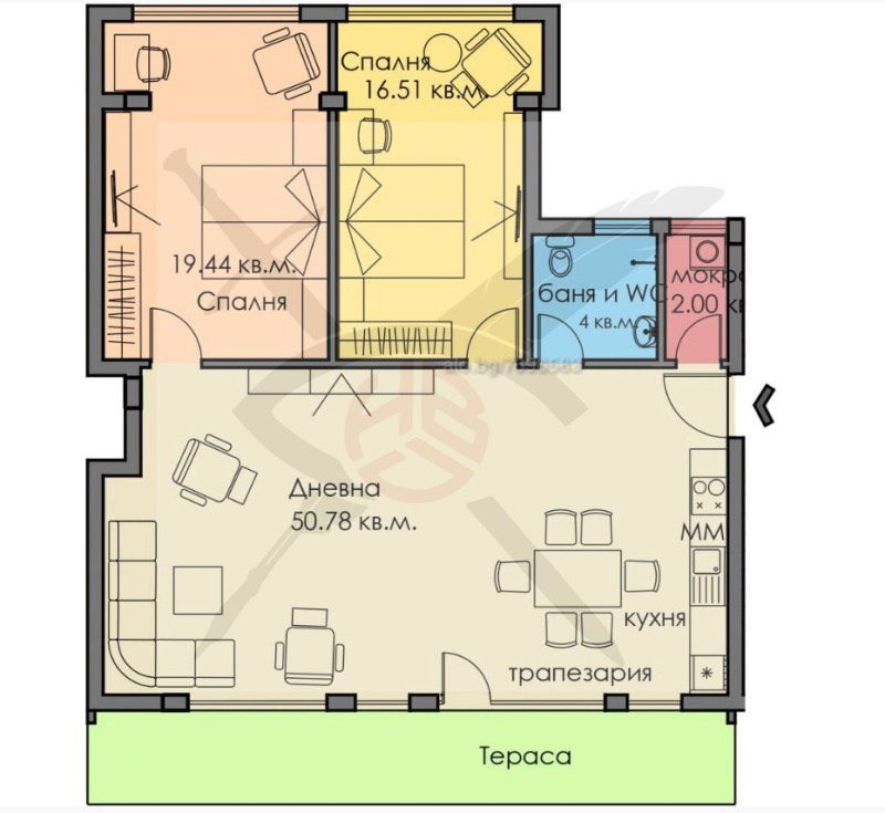 РАЗПРЕДЕЛЕНИЕ: Жилището разполага с площ от 138 кв.м. разпределена в две спални, просторна дневна с трапезария и кухненски бокс, баня и тоалетна, мокро помещение и тераса.