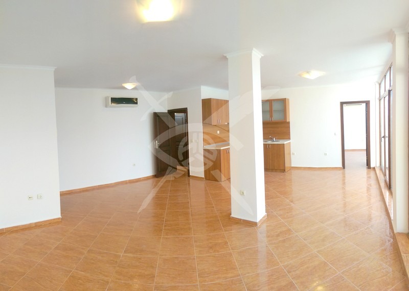 РАЗПРЕДЕЛЕНИЕ: Жилището разполага с площ от 144кв.м., състои се от просторен хол с кухненски бокс, две спални, баня с тоалетна и две тераси, едната от които е с гледка море.
