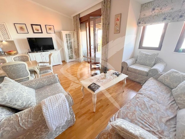 РАЗПРЕДЕЛЕНИЕ: Жилището разполага с площ 114кв.м., състои се от хол с кухненски бокс, две спални, баня с тоалетна и тераса с гледка море.