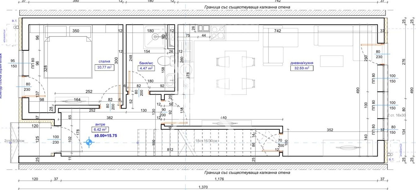 РАЗПРЕДЕЛЕНИЕ: Жилището разполага с площ 156кв.м., състои се от хол с кухня, бяна с тоалетна и спалня на първи етаж и две спални, два дрешника и две мокри помещения на втори етаж. Има веранда с площ 30кв.м.