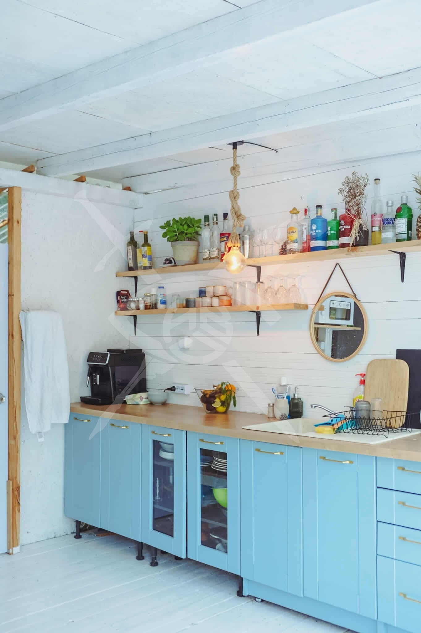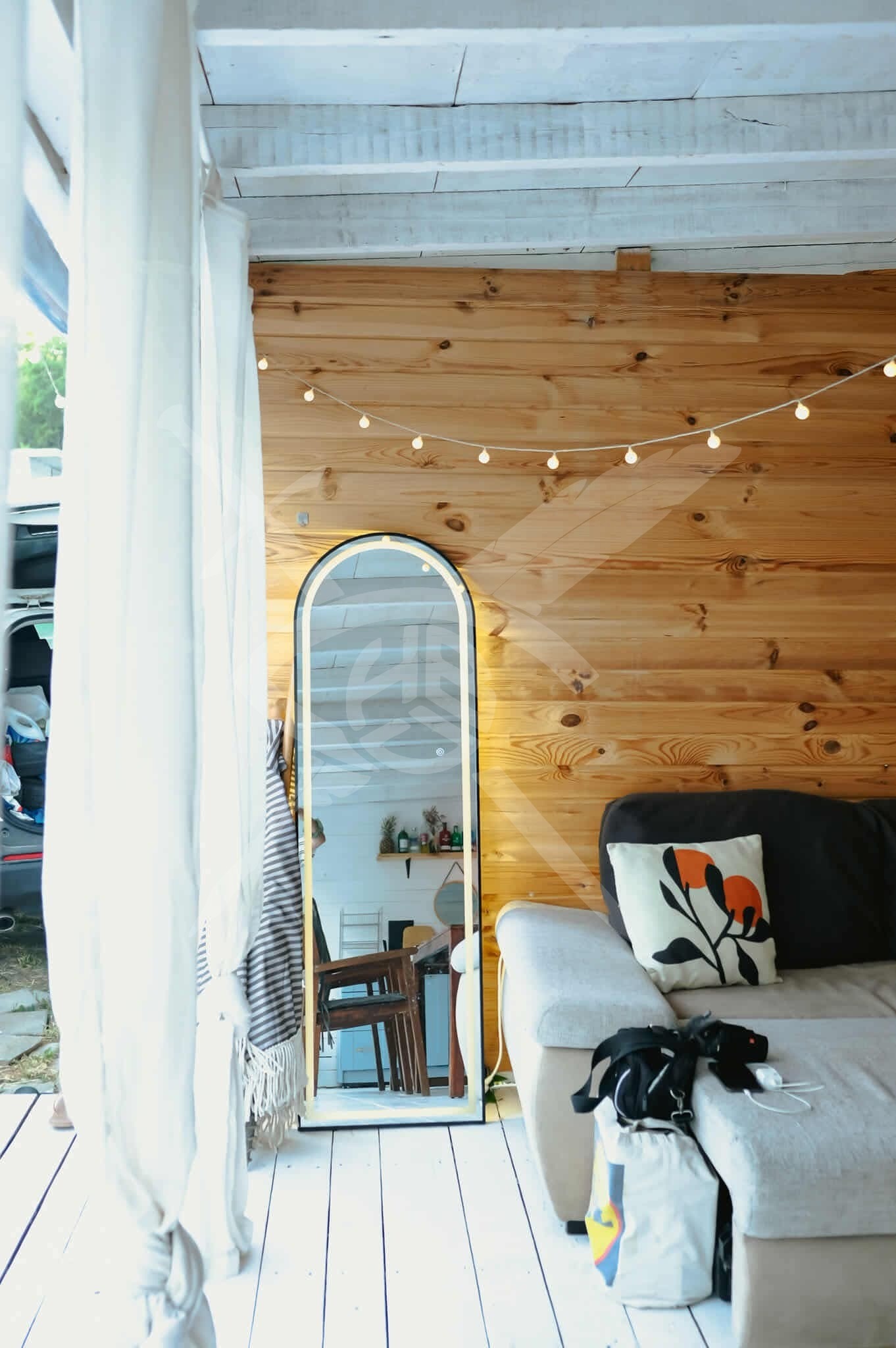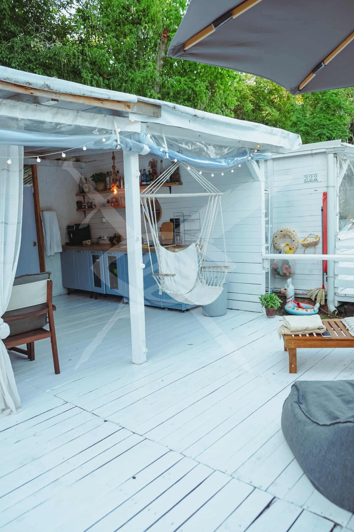 каравана с просторен навес 70 кв.м. като половината е закрита, а другата открита. Караваната разполага с нов климатик, две големи легла (160х200), бюро, както и два гардероба и шкафче за съхранение. Външната зона включва напълно оборудвана кухня с всичко необходимо, както и собствена баня с тоалетна и пералня.